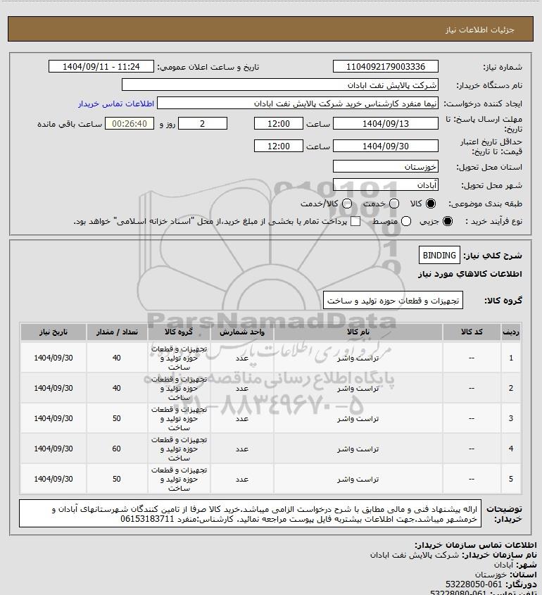 | 5 | -- | تراست واشر | عدد | تجهیزات و قطعات حوزه تولید و ساخت | 50 | 1404/09/30 |
