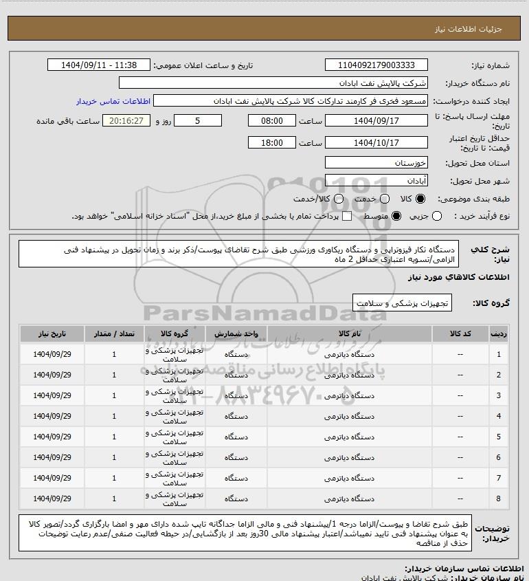 شرح کلی نیاز: دستگاه تکار فیزوتراپی و دستگاه ریکاوری ورزشی طبق شرح تقاضای پیوست/ذکر برند و زمان تحویل در پیشنهاد فنی الزامی/تسویه اعتباری حداقل 2 ماه