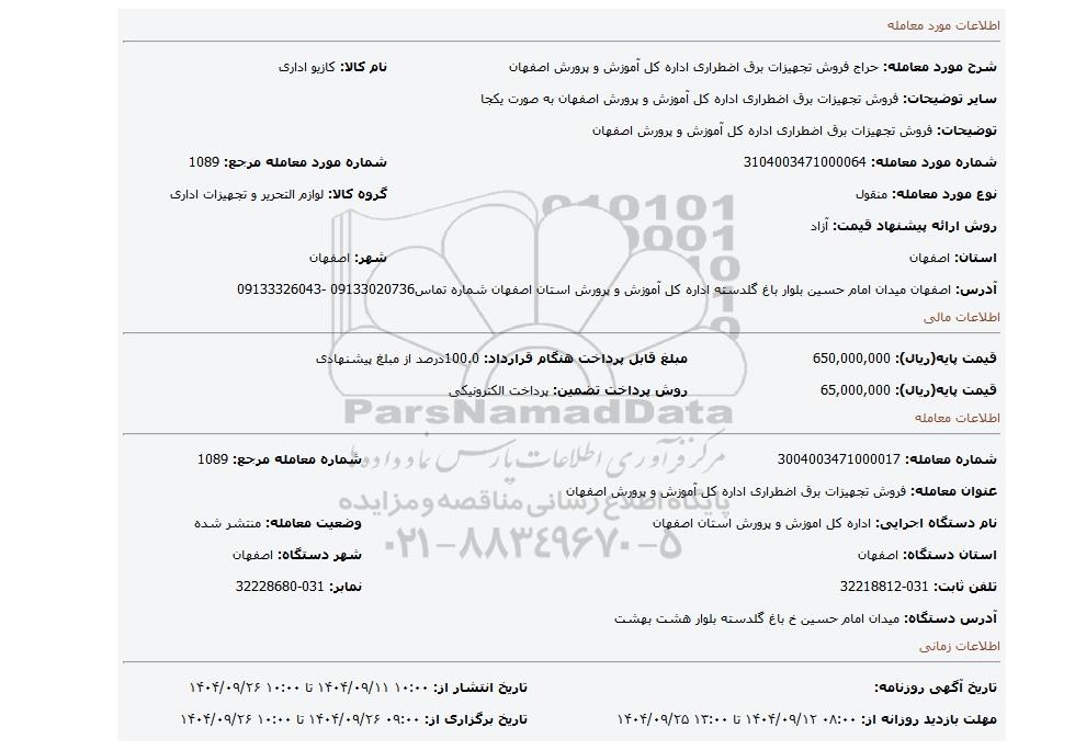 | عنوان معامله: فروش تجهیزات برق اضطراری اداره کل آموزش و پرورش اصفهان | ||