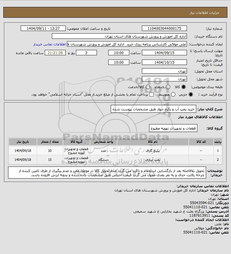 شرح کلی نیاز: خرید پمپ آب و پکیج دیوار طبق مشخصات پیوست شده