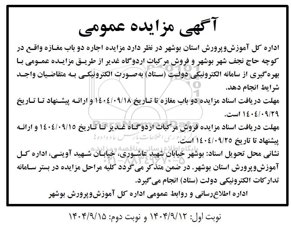 اداره کل آموزش و پرورش استان بوشهر در نظر دارد مزایده اجاره دو باب مغازه واقع در کوچه حاج نجف شهر بوشهر و فروش مرکبات اردوگاه غدیر از طریق مزایده عمومی با بهره گیری از سامانه الکترونیکی دولت (ستاد) به صورت الکترونیکی به متقاضیان واجد شرایط انجام دهد.