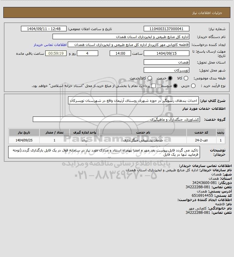 شرح کلی نیاز: احداث بندهای رسوبگیر در حوزه شهری روستای آرتیمان واقع در شهرستان تویسرکان
