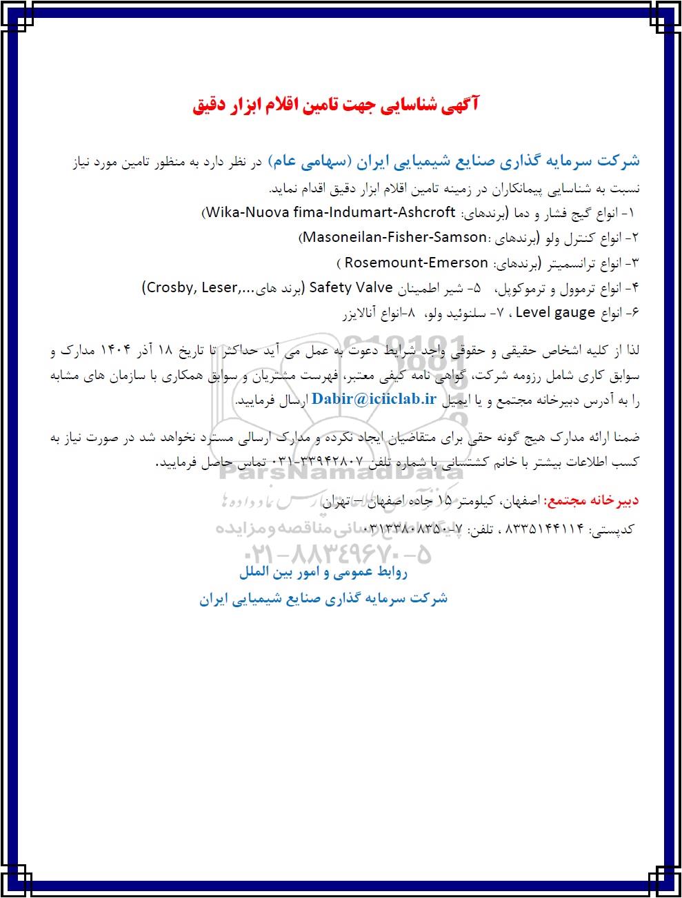 شرکت سرمایه گذاری صنایع شیمیایی ایران (سهامی عام) در نظر دارد به منظور تامین مورد نیاز نسبت به شناسایی پیمانکاران در زمینه تامین اقلام ابزار دقیق اقدام نماید.