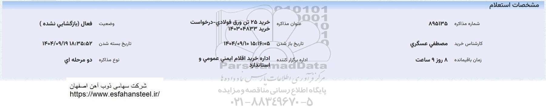 عنوان مذاکره: خرید 25 تن ورق فولادی - درخواست خرید 140304833
