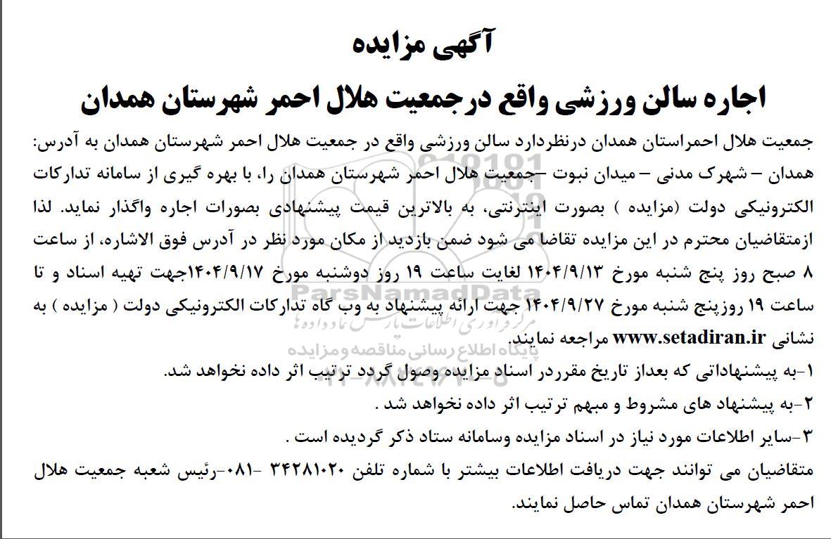 جمعیت هلال احمر استان همدان در نظر دارد سالن ورزشی واقع در جمعیت هلال احمر شهرستان همدان به آدرس همدان - شهرک مدنی - میدان نبوت جمعیت هلال احمر شهرستان همدان را با بهره گیری از سامانه تدارکات الکترونیکی دولت مزایده بصورت اینترنتی به بالاترین قیمت پیشنهادی بصورات اجاره واگذار نماید. لذا از متقاضیان محترم در این مزایده تقاضا میشود ضمن بازدید از مکان مورد نظر در آدرس فوق الاشاره از ساعت صبح روز پنج شنبه مورخ 1404.9.13 لغایت ساعت 19 روز دوشنبه مورخ 1404.9.17 جهت تهیه اسناد و تا ساعت 19 روز پنج شنبه مورخ 1404.9.27 جهت ارائه پیشنهاد به وب گاه تدارکات الکترونیکی دولت ( مزایده ) به