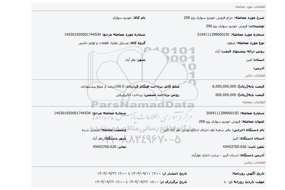 | عنوان معامله: فروش خودرو سواری پژو 206 | ||