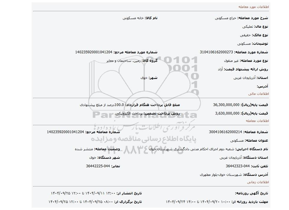 مزایده عمومی مزایده مسکونی برگزار میگردد. از کلیه افراد متخصص و شرکت‌های واجد شرایط دعوت به عمل می‌آید تا در این مزایده با کد خبرگزاری پارس نماد : 9934695 شرکت نمایند تاریخ شروع مزایده : 1404/09/11 مهلت شرکت در مزایده: تا پایان روز 1404/09/25 مکان برگزاری اموال واگذاری استان‌های مزایدات استان آذربایجان غربی و دسته‌بندی‌های مربوط به این حراجی املاک و زمین میباشد.