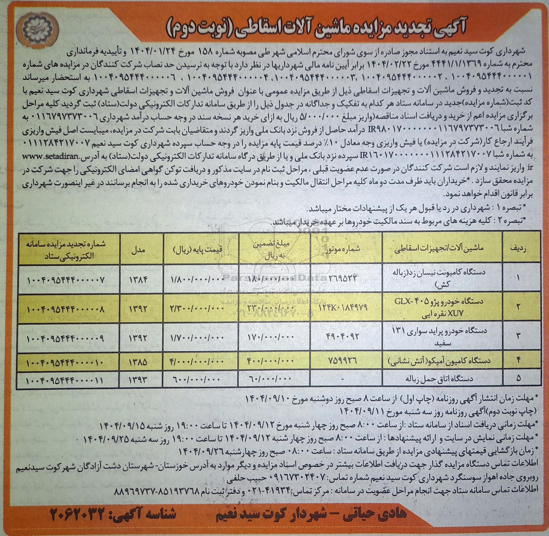 احتراماً شهرداری کوت سید نعیم به استناد مجوز صادره از سوی شورای محترم اسلامی شهر طی مصوبه شماره 158 مورخ 1404.01.24 و تأییدیه فرمانداری محترم به شماره 4441/1/1369 مورخ 1404.02.22 برابر آیین نامه مالی شهرداری ها در نظر دارد با توجه به نرسیدن حد نصاب شرکت کنندگان در مزایده های شماره 1004095444000001 ، 1004095444000002 ، 1004095444000003 ، 1004095442000004 ، 1004095424000006 به استحضار میرساند نسبت به تجدید و فروش ماشین آلات و تجهیزات اسقاطی ذیل از طریق مزایده عمومی با عنوان فروش ماشین آلات و تجهیزات اسقاطی شهرداری کوت سید نعیم با کد ثبت شماره مزایده جدید در سامانه ستاد هر کدام به تفکیک و جداگانه در جدول ذیل را از طریق سامانه تدارکات الکترونیکی دولت (ستاد) ثبت گردید کلیه مراحل برگزاری مزایده اعم از خرید و دریافت اسناد مناقصه واریز مبلغ 5.000.000 ریال به ازای خرید هر نسخه سند در وجه حساب درآمد شهرداری 0116797373006 به شماره شبا IR980170000000116797373006 درآمد حاصل از فروش نزد بانک ملی واریز گردند و متقاضیان بابت شرکت در مزایده میبایست اصل فیش واریزی فرآیند ارجاع کار شرکت در مزایده، یا فیش واریزی وجه معادل 10 درصد قیمت پایه مزایده را در وجه حساب سپرده شهرداری کوت سید نعیم 0111284217007 به شماره شبا R160170000000111284217007 سپرده نزد بانک ملی و یا از طریق درگاه سامانه تدارکات الکترونیکی دولت (ستاد) واریز نمایند و لازم است شرکت کنندگان در صورت عدم عضویت قبلی مراحل ثبت نام در سایت مذکور و دریافت توکن گواهی امضای الکترونیکی را جهت شرکت در مزایده محقق سازد.