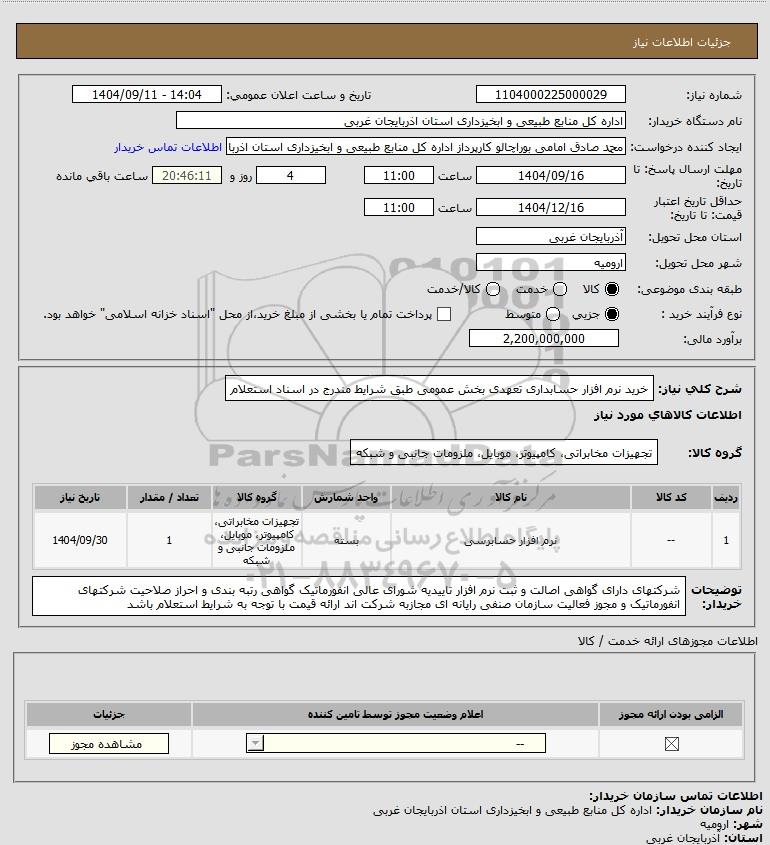شرح کلی نیاز: خرید نرم افزار حسابداری تعهدی بخش عمومی طبق شرایط مندرج در اسناد استعلام