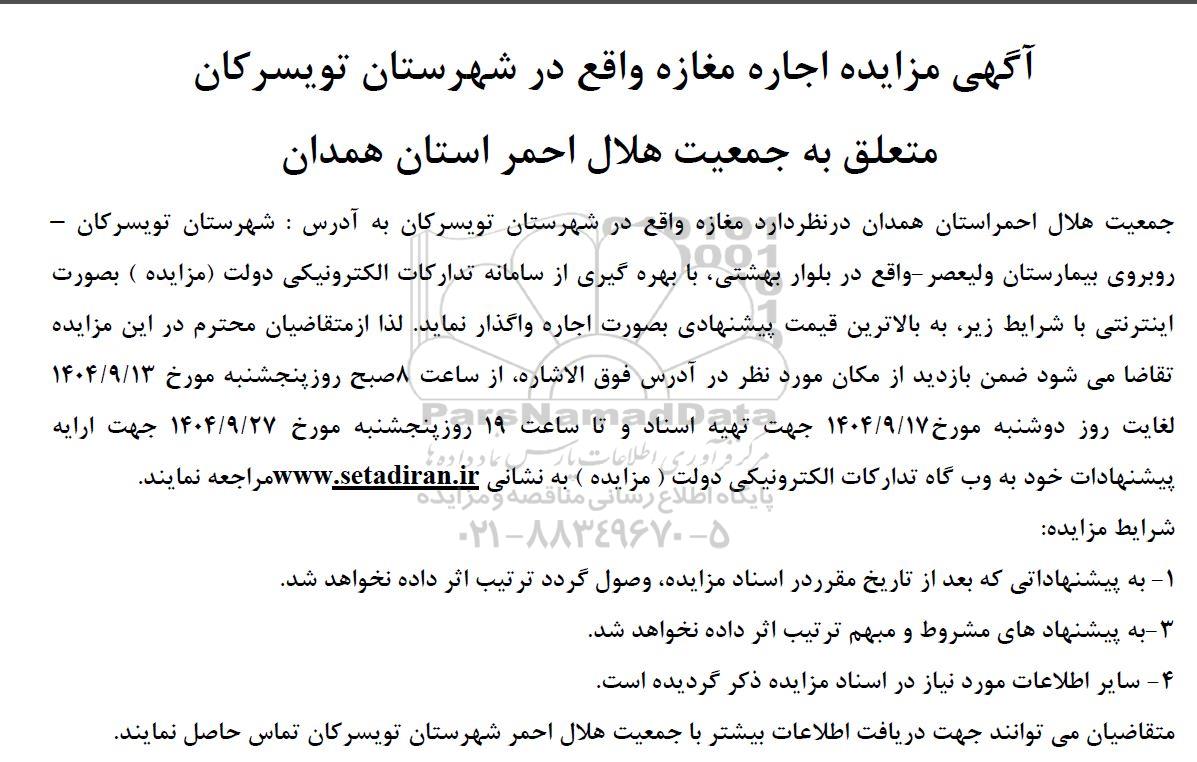 آگهی مزایده اجاره مغازه واقع در شهرستان تویسرکان متعلق به جمعیت هلال احمر استان همدان