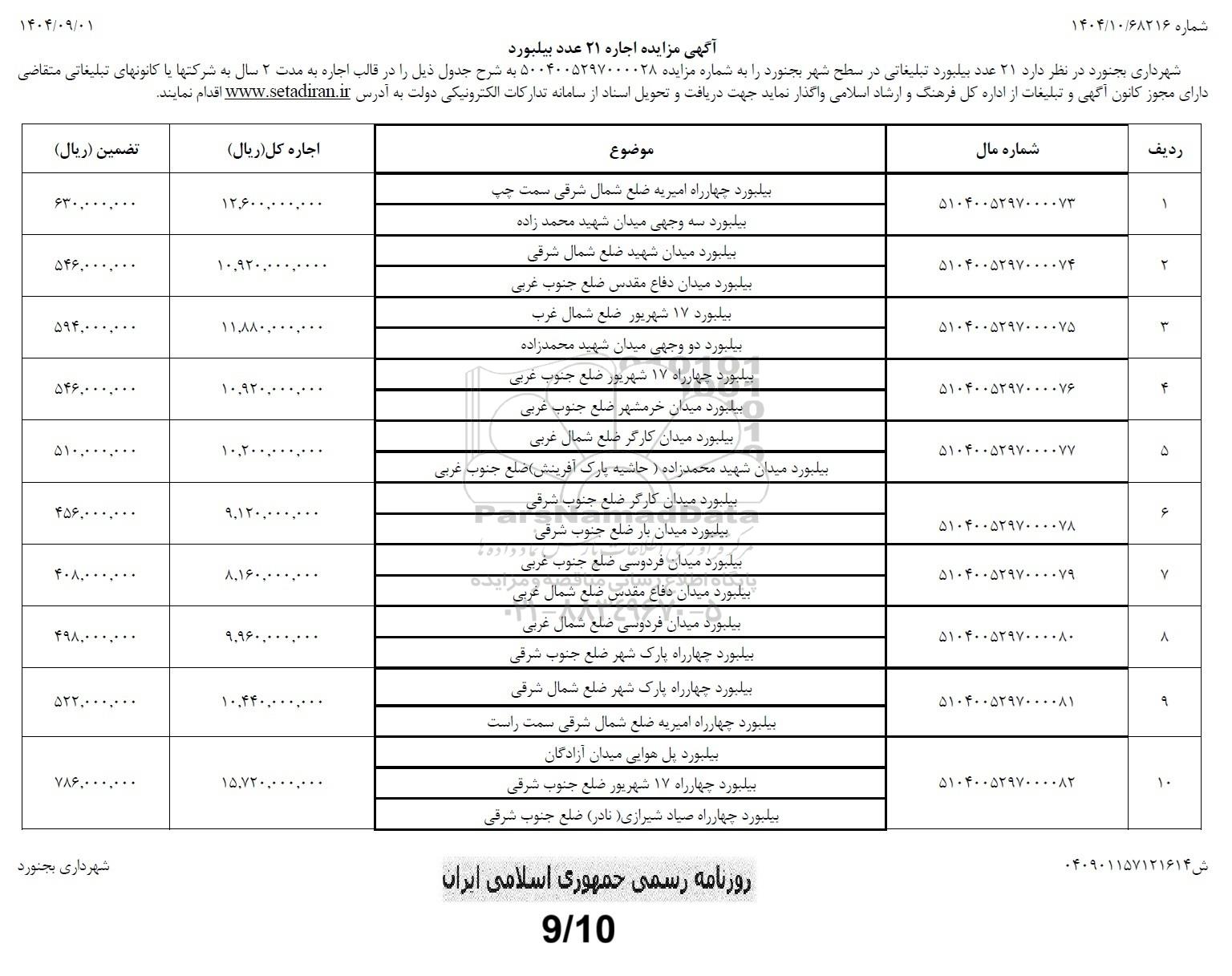 | 9 | 5104005297000081 | بیلبورد چهارراه پارک شهر ضلع شمال شرقی | 10.440.000.000 | 522.000.000 |