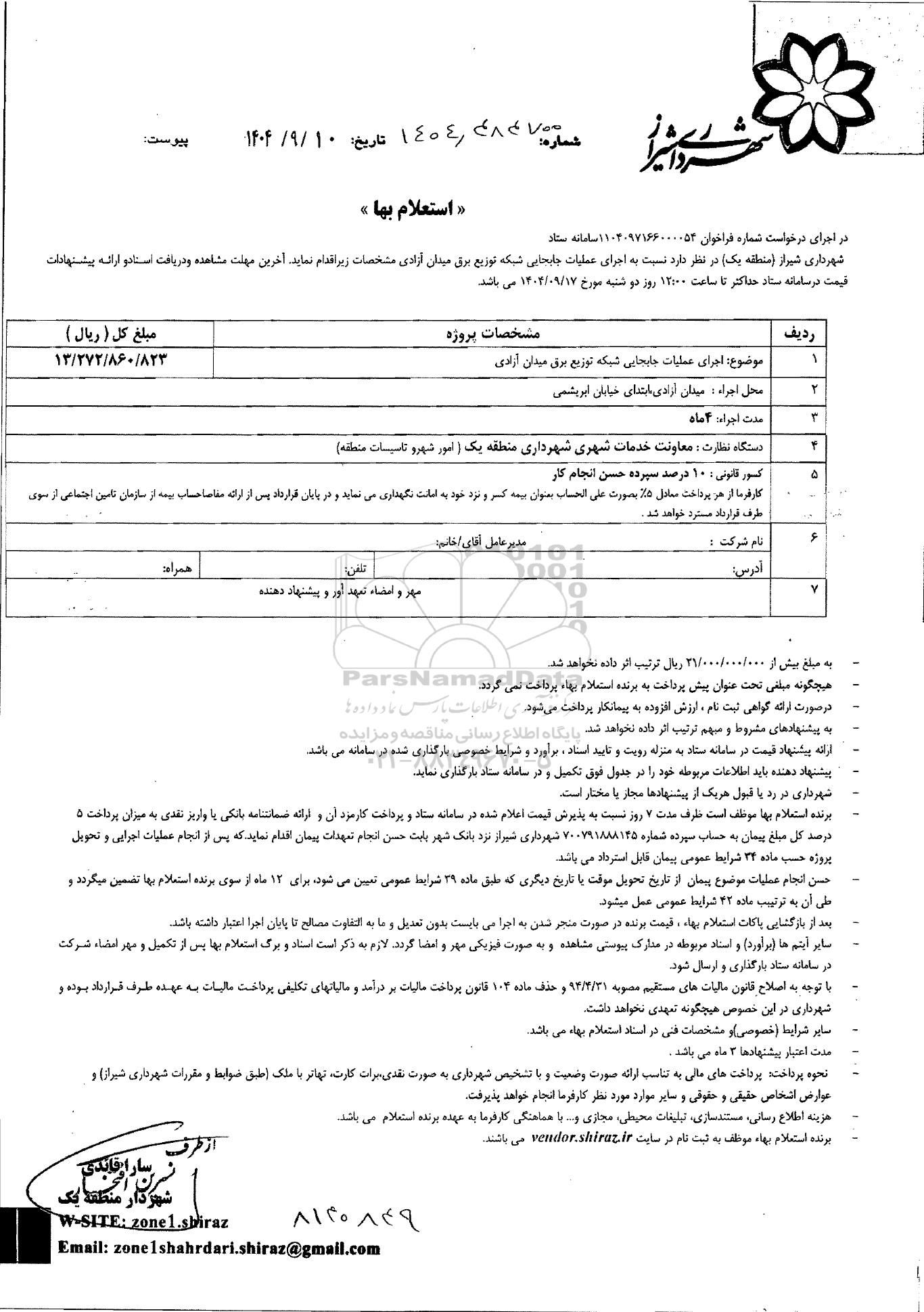شهرداری شلمزار به استناد بند 1 صورتجلسه شماره 76 مورخ 1403.12.15 شورای اسلامی شهر شلمزار در نظردارد اقدام به فروش یک دستگاه کامیون کمپرسی از طریق مزایده بنماید. لذا از متقاضیان دعوت بعمل می آید جهت دریافت اسناد مزایده به سامانه تدارکات الکترونیکی دولت (ستاد) مراجعه فرمایند.