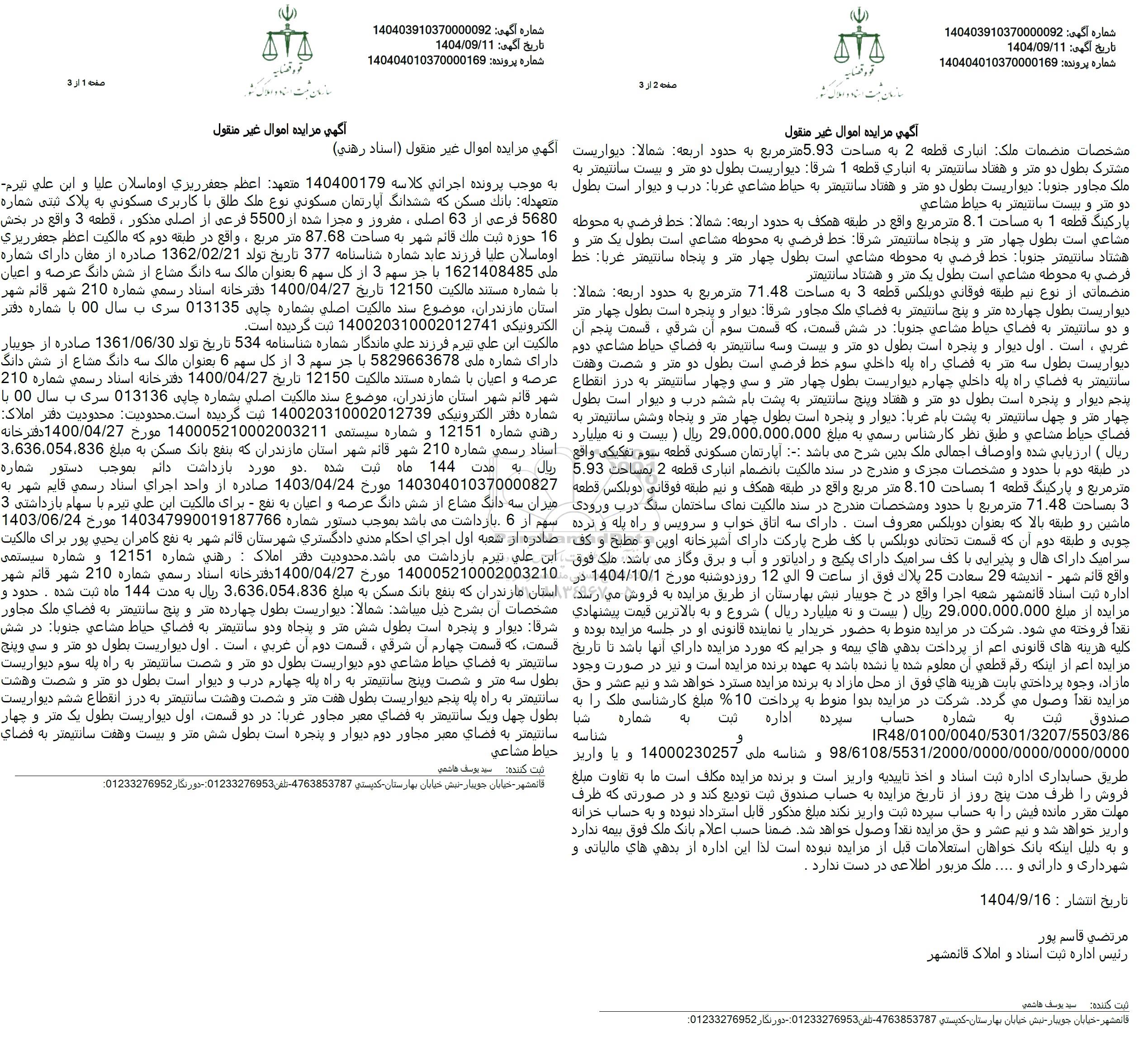 پارکینگ قطعه 1 به مساحت 8.1 متر مربع واقع در طبقه همکف به حدود اربعه شمالا خط فرضی به محوطه مشاعی است بطول چهار متر و پنجاه سانتیمتر شرقا خط فرضی به محوطه مشاعی است بطول یک متر و هشتاد سانتیمتر جنوبا خط فرضی به محوطه مشاعی است بطول چهار متر و پنجاه سانتیمتر غربا خط فرضی به محوطه مشاعی است بطول یک متر و هشتاد سانتیمتر منضماتی از نوع نیم طبقه فوقانی دوبلکس قطعه 3 به مساحت 71.48 متر مربع به حدود اربعه شمالا دیواریست بطول چهارده متر و پنج سانتیمتر به فضای ملک مجاور شرقا دیوار و پنجره است بطول چهار متر و دو سانتیمتر به فضای حیاط مشاعی جنوبا در شش قسمت که قسمت سوم أن شرقی ، قسمت پنجم آن غربی ، است . اول دیوار و پنجره است بطول دو متر و بیست و سه سانتیمتر به فضای حیاط مشاعی دوم دیواریست بطول سه متر به فضای راه پله داخلی سوم خط فرضی است بطول دو متر و شصت و هفت سانتیمتر به فضای راه پله داخلی چهارم دیواریست بطول چهار متر و سی و چهار سانتیمتر به درز انقطاع پنجم دیوار و پنجره است بطول دو متر و هفتاد و پنج سانتیمتر به پشت بام ششم درب و دیوار است بطول چهار متر و چهل سانتیمتر به پشت بام غربا دیوار و پنجره است بطول چهار متر و پنجاه و شش سانتیمتر به فضای حیاط مشاعی و طبق نظر کارشناس رسمی به مبلغ 29،000،000،000 ریال ( بیست بیست و نه میلیارد ریال ( ارزیابی شده و اوصاف اجمالی ملک بدین شرح میباشد :: آپارتمان مسکونی قطعه سوم تفکیکی واقع در طبقه دوم با حدود و مشخصات مجزی و مندرج در سند مالکیت بانضمام انباری قطعه 2 بمساحت 5.93 متر مربع و پارکینگ قطعه 1 بمساحت 8.10 متر مربع واقع در طبقه همکف و نیم طبقه فوقانی دوبلکس قطعه 3 بمساحت 71.48 متر مربع با حدود و مشخصات مندرج در سند مالکیت نمای ساختمان سنگ درب ورودی ماشین رو طبقه بالا که بعنوان دوبلکس معروف است. دارای سه اتاق خواب و سرویس و راه پله و نرده چوبی و طبقه دوم آن که قسمت تحتانی دوبلکس با کف طرح پارکت دارای آشپزخانه اوین و مطبخ و کف سرامیک دارای هال و پذیرایی با کف سرامیک دارای پکیج و رادیاتور و آب و برق و گاز می باشد. ملک فوق واقع قائم شهر - اندیشه 29 سعادت 25 پلاک فوق از ساعت 9 الی 12 روز دوشنبه مورخ 1404.10.1 در اداره ثبت اسناد قائم شهر شعبه اجرا واقع در خ جویبار نبش بهارستان از طریق مزایده به فروش می رسد. مزایده از مبلغ 29،000،000،000 ریال ) بیست و نه میلیارد ریال ( شروع و به بالاترین قیمت پیشنهادی نقدا فروخته می شود شرکت در مزایده منوط به حضور خریدار یا نماینده قانونی او در جلسه مزایده بوده و کلیه هزینه های قانونی اعم از پرداخت بدهی های بیمه و جرایم که مورد مزایده دارای آنها باشد تا تاریخ مزایده اعم از اینکه رقم قطعی آن معلوم شده یا نشده باشد به عهده برنده مزایده است و نیز در صورت وجود مازاد وجوه پرداختی بابت هزینه های فوق از محل مازاد به برنده مزایده مسترد خواهد شد و نیم عشر و حق مزایده نقدا وصول می گردد. شرکت در مزایده بدوا منوط به پرداخت 10% مبلغ کارشناسی ملک را به صندوق ثبت به شماره حساب سپرده اداره ثبت به شماره شبا شناسه IR48.0100.0040.5301.3207.5503.86و شناسه