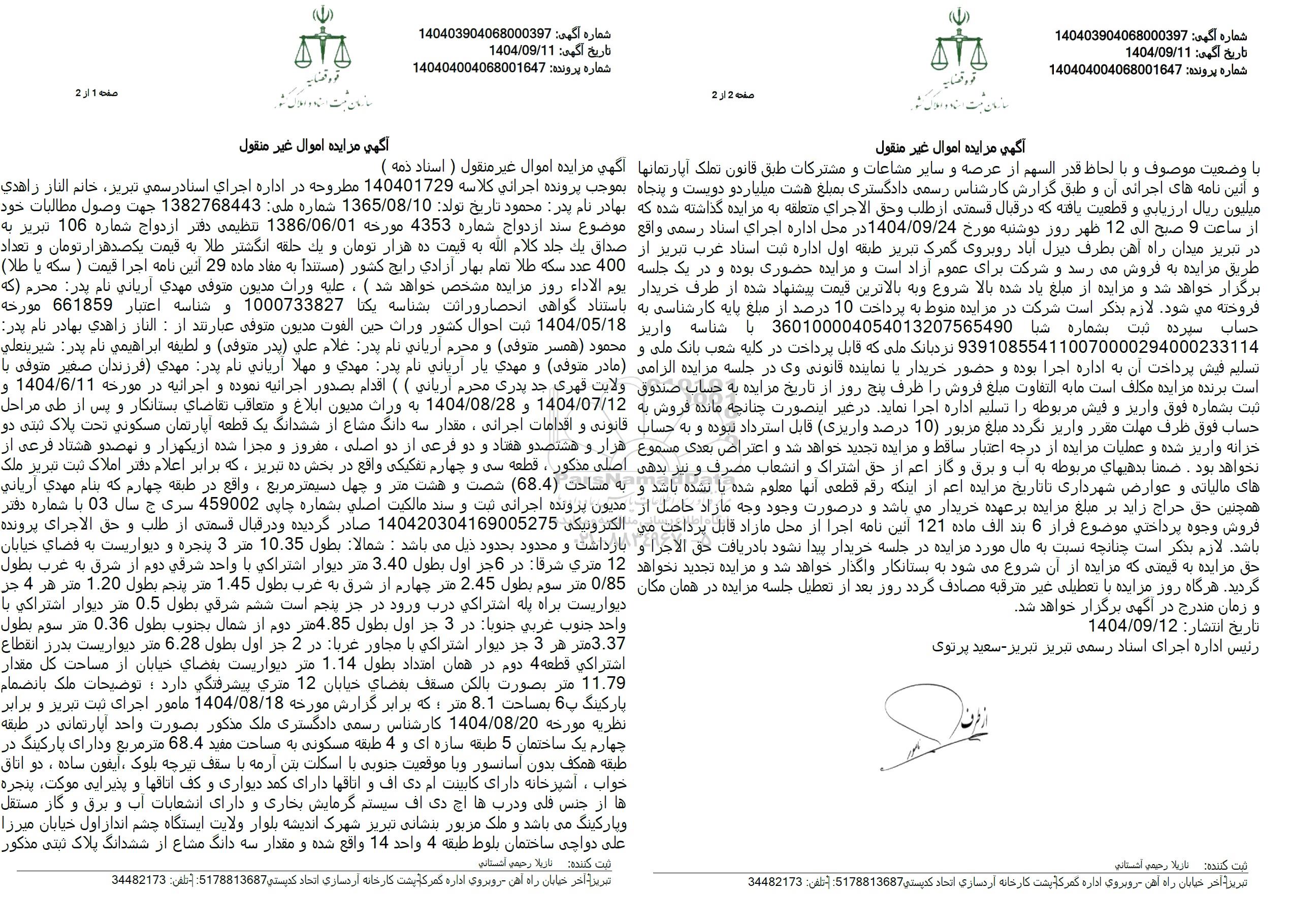 بموجب پرونده اجرائی کلاسه 140401729 مطروحه در اداره اجرای اسناد رسمی تبریز، خانم الناز زاهدی بهادر نام پدر محمود تاریخ تولد 1365.08.10 شماره ملی 1382768443 جهت وصول مطالبات خود موضوع سند ازدواج شماره 4353 مورخه 1386.06.01 تنظیمی دفتر ازدواج شماره 106 تبریز به صداق یک جلد کلام الله به قیمت ده هزار تومان و یک حلقه انگشتر طلا به قیمت یکصد هزار تومان و تعداد 400 عدد سکه طلا تمام بهار آزادی رایج کشور مستندا به مفاد ماده 29 آئین نامه اجرا قیمت (سکه یا طلا) یوم الاداء روز مزایده مشخص خواهد شد . علیه وراث مدیون متوفى مهدی اربانی نام پدر: محرم که باستناد گواهی انحصار وراثت بشناسه یکتا 1000733827 و شناسه اعتبار 661859 مورخه 1404.05.18 ثبت احوال کشور ورات حین الفوت مدیون متوفى عبارتند از : الناز زاهدی بهادر نام پدر محمود همسر متوفی و محرم اربانی نام پدر غلام علی پدر متوفی و لطیفه ابراهیمی نام پدر شیرینعلی مادر متوفی و مهدی بار آریانی نام پدر مهدی و مهلا اربانی نام پدر مهدی فرزندان صغیر متوفی با ولایت قهری جد پدری محرم اریانی اقدام بصدور اجرائیه نموده و اجرائیه در مورخه 1404.6.11 و 1404.07.12 و 1404.08.28 به وراث مدیون ابلاغ و متعاقب تقاضای بستانکار و پس از طی مراحل قانونی و اقدامات اجرانی، مقدار سه دانگ مشاع از ششدانگ یک قطعه آپارتمان مسکونی تحت پلاک ثبتی دو هزار و هشتصد و هفتاد و دو فرعی از دو اصلی، مفروز و مجزا شده از یکهزار و نهصد و هشتاد فرعی از اصلی مذکور، قطعه سی و چهارم تفکیکی واقع در بخش ده تبریز که برابر اعلام دفتر املاک ثبت تبریز ملک به مساحت (68.4) شصت و هشت متر و چهل دسیمتر مربع ، واقع در طبقه چهارم که بنام مهدی اریانی مدیون پرونده اجرانی ثبت و سند مالکیت اصلی بشماره چاپی 459002 سری ج سال 03 با شماره دفتر الکترونیکی 140420304169005275 صادر گردیده و در قبال قسمتی از طلب و حق الاجرای پرونده بازداشت و محدود بحدود ذیل میباشد: شمالا بطول 10.35 متر 3 پنجره و دیواریست به فضای خیابان 12 متری شرقا در 6 جر اول بطول 3.40 متر دیوار اشتراکی با واحد شرقی دوم از شرق به غرب بطول 0.85 متر سوم بطول 2.45 متر چهارم از شرق به غرب بطول 1.45 متر پنجم بطول 1.20 متر هر 4 جر دیواریست براه پله اشتراکی درب ورود در جز پنجم است ششم شرقی بطول 0.5 متر دیوار اشتراکی با واحد جنوب غربی جنوبا در 3 جر اول بطول 4.85 متر دوم از شمال بجنوب بطول 0.36 متر سوم بطول 3.37 متر هر 3 جز دیوار اشتراکی با مجاور غربا در 2 جر اول بطول 6.28 متر دیواریست بدرز انقطاع اشتراکی قطعه 4 دوم در همان امتداد بطول 1.14 متر دیواریست بفضای خیابان از مساحت کل مقدار 11.79 متر بصورت بالکن مسقف بقضای خیابان 12 متری پیشرفتگی دارد توضیحات ملک بانضمام پارکینگ ب 6 بمساحت 8.1 متر : که برابر گزارش مورخه 1404.08.18 مامور اجرای ثبت تبریز و برابر نظریه مورخه 1404.08.20 کارشناس رسمی دادگستری ملک مذکور بصورت واحد آپارتمانی در طبقه چهارم یک ساختمان 5 طبقه سازه ای و 4 طبقه مسکونی به مساحت مفید 68.4 متر مربع و دارای پارکینگ در طبقه همکف بدون اسانسور و با موقعیت جنوبی با اسکلت بتن آرمه با سقف تیرچه بلوک ، ایفون ساده، دو اتاق خواب، آشپرخانه دارای کابینت ام دی اف و اتاقها دارای کمد دیواری و کف اتاقها و پذیرایی موکت پنجره ها از جنس فلی و دربها اچ دی اف سیستم گرمایش بخاری و دارای انشعابات آب و برق و گار مستقل و پارکینگ می باشد و ملک مزبور بنشانی تبریز شهرک اندیشه بلوار ولایت ایستگاه چشم انداز اول خیابان میرزا علی دواجی ساختمان بلوط طبقه 4 واحد 14 واقع شده و مقدار سه دانگ مشاع از ششدانگ پلاک ثبتی مذکور با وضعیت موصوف و با لحاظ قدر السهم از عرصه و سایر مشاعات و مشترکات طبق قانون تملک آپارتمانها و آئین نامه های اجرائی آن و طبق گزارش کارشناس رسمی دادگستری بمبلغ هشت میلیاردو دویست و پنجاه میلیون ریال ارزیابی و قطعیت یافته که در قبال قسمتی از طلب وحق الاجرای متعلقه به مزایده گذاشته شده که از ساعت 9 صبح الی 12 ظهر روز دوشنبه مورخ 1404.09.24 در محل اداره اجرای اسناد رسمی واقع در تبریز میدان راه آهن بطرف دی