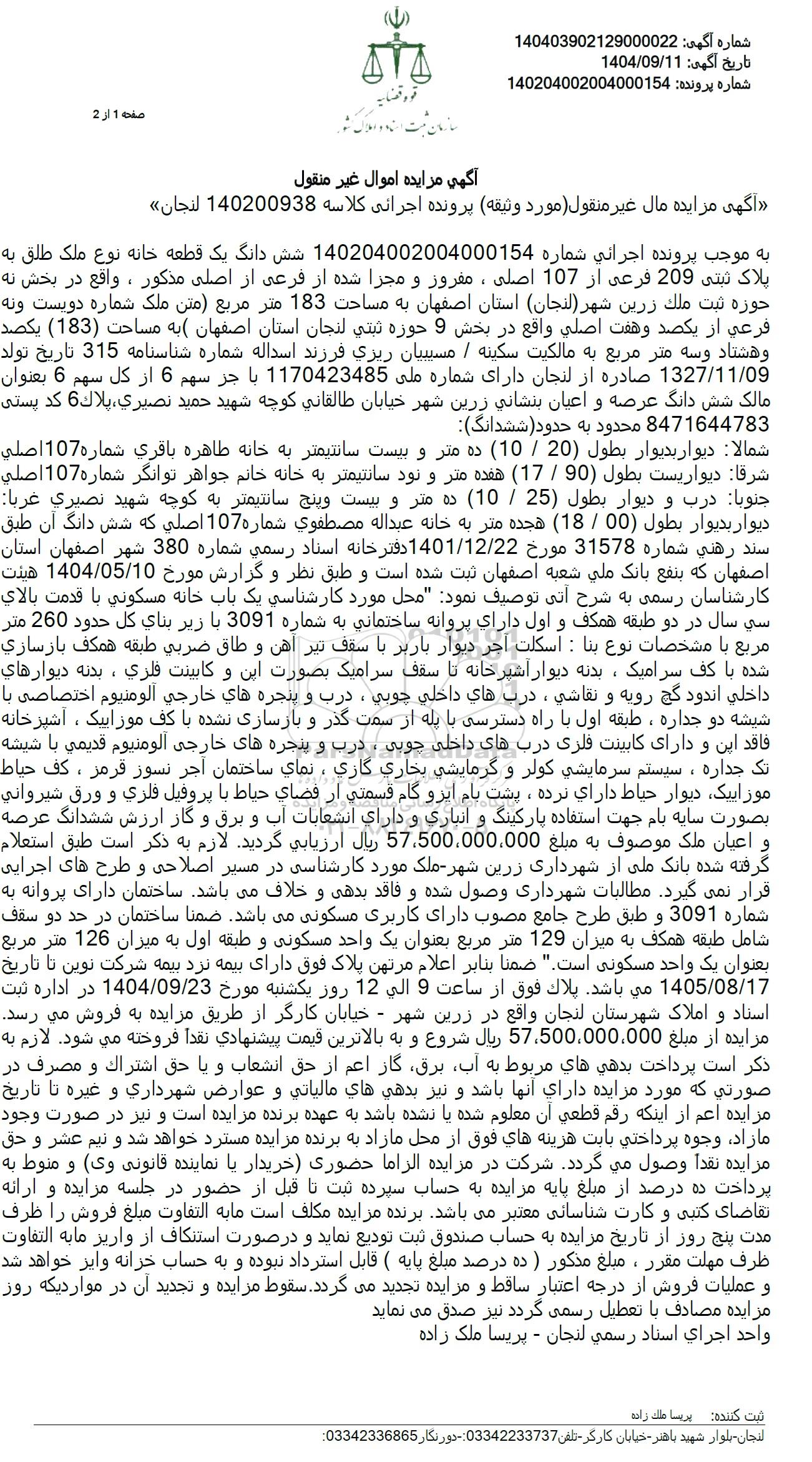 «آگهی مزایده مال غیر منقول مورد وثیقه پرونده اجرائی کلاسه 140200938 لنجان