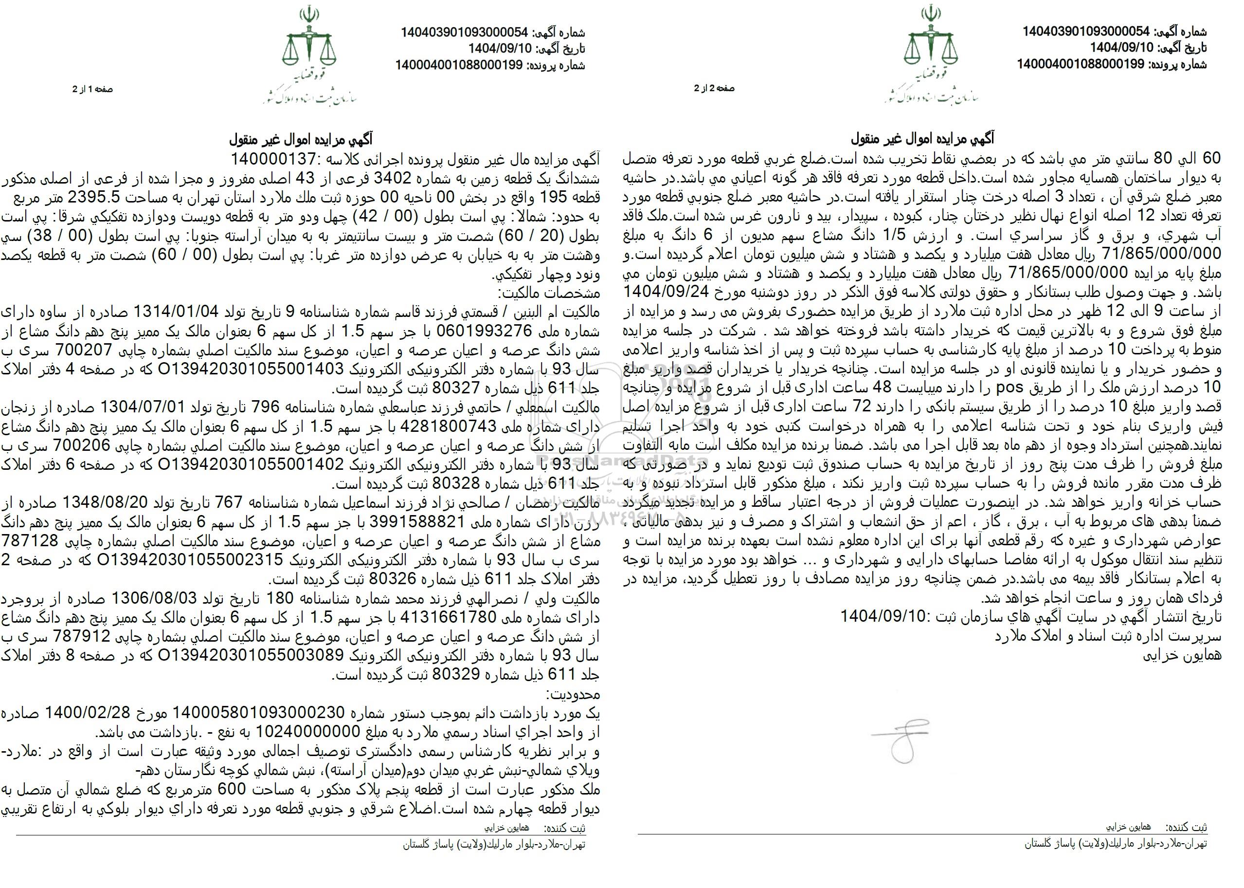 تاریخ مزایده 1404.9.24 از ساعت 9 الی 12 ظهر در محل اداره ثبت ملارد
