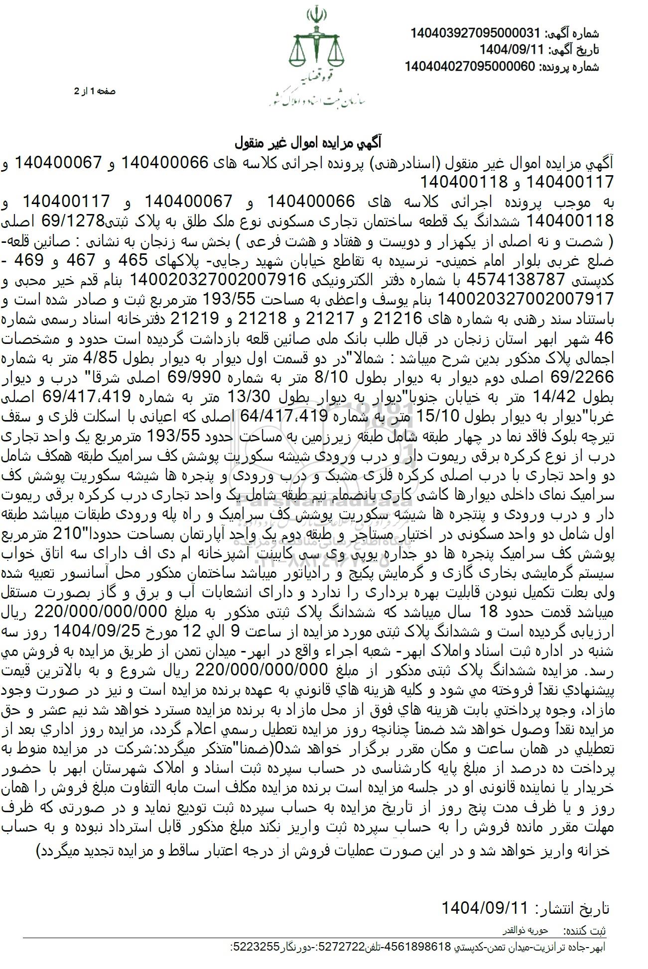 به موجب پرونده اجرائی کلاسه های 140400066 و 140400067 و 140400117 و 140400118 ششدانگ یک قطعه ساختمان تجاری مسکونی نوع ملک طلق به پلاک ثبتی 69.1278 اصلی شصت و نه اصلی از یکهزار و دویست و هفتاد و هشت فرعی ( بخش سه زنجان به نشانی : صائین قلعه ضلع غربی بلوار امام خمینی نرسیده به تقاطع خیابان شهید رجایی پلاکهای 465 و 467 و 469 -کدپستی 4574138787 با شماره دفتر الکترونیکی 140020327002007916 بنام قدم خیر محبی و 140020327002007917 بنام یوسف واعظی به مساحت 193.55 متر مربع ثبت و صادر شده است و باستناد سند رهنی به شماره های 21216 و 21217 و 21218 و 21219 دفترخانه اسناد رسمی شماره 46 شهر ابهر استان زنجان در قبال طلب بانک ملی صائین قلعه بازداشت گردیده است حدود و مشخصات اجمالی پلاک مذکور بدین شرح میباشد : شمالا در دو قسمت اول دیوار به دیوار بطول 4.85 متر به شماره 69.2266 اصلی دوم دیوار به دیوار بطول 8.10 متر به شماره 69.990 اصلی شرقا درب و دیوار بطول 14.42 متر به خیابان جنوبا دیوار به دیوار بطول 13.30 متر به شماره 69.417،419 اصلی غربا دیوار به دیوار بطول 15.10 متر به شماره 419، 64.417 اصلی که اعیانی با اسکلت فلزی و سقف تیرچه بلوک فاقد نما در چهار طبقه شامل طبقه زیرزمین به مساحت حدود 193.55 متر مربع یک واحد تجاری درب از نوع کرکره برقی ریموت دار و درب ورودی شیشه سکوریت پوشش کف سرامیک طبقه همکف شامل دو واحد تجاری با درب اصلی کرکره فلزی مشبک و درب ورودی و پنجره ها شیشه سکوریت پوشش کف سرامیک نمای داخلی دیوارها کاشی کاری بانضمام نیم طبقه شامل یک واحد تجاری درب کرکره برقی ریموت دار و درب ورودی و پنتجره ها شیشه سکوریت پوشش کف سرامیک و راه پله ورودی طبقات میباشد طبقه اول شامل دو واحد مسکونی در اختیار مستاجر و طبقه دوم یک واحد آپارتمان بمساحت حدودا 210 متر مربع پوشش کف سرامیک پنجره ها دو جداره یوپی وی سی کابینت آشپزخانه ام دی اف دارای سه اتاق خواب سیستم گرمایشی بخاری گازی و گرمایش پکیج و رادیاتور میباشد ساختمان مذکور محل آسانسور تعبیه شده ولی بعلت تکمیل نبودن قابلیت بهره برداری را ندارد و دارای انشعابات آب و برق و گاز بصورت مستقل میباشد قدمت حدود 18 سال میباشد که ششدانگ پلاک ثبتی مذکور به مبلغ 220.000.000.000 ریال ارزیابی گردیده است و ششدانگ پلاک ثبتی مورد مزایده از ساعت 9 الی 12 مورخ 1404.09.25 روز سه شنبه در اداره ثبت اسناد و املاک ابهر - شعبه اجراء واقع در ابهر میدان ته اجراء واقع در ابهر میدان تمدن از طریق مزایده به فروش می رسد. مزایده ششدانگ پلاک ثبتی مذکور از مبلغ 220.000.000.000 ریال شروع و به بالاترین قیمت پیشنهادی نقداً فروخته میشود و کلیه هزینه های قانونی به عهده برنده مزایده است و نیز در صورت وجود مازاد وجوه پرداختی بابت هزینه های فوق از محل مازاد به برنده مزایده مسترد خواهد شد نیم عشر و حق مزایده نقدا وصول خواهد شد ضمنا چنانچه روز مزایده تعطیل رسمی اعلام گردد مزایده روز اداری بعد از تعطیلی در همان ساعت و مکان مقرر برگزار خواهد شد ه ضمنا متذکر میگردد شرکت در مزایده منوط به پرداخت ده درصد از مبلغ پایه کارشناسی در حساب سپرده ثبت اسناد و املاک شهرستان ابهر با حضور خریدار یا نماینده قانونی او در جلسه مزایده است برنده مزایده مکلف است ما به التفاوت مبلغ فروش را همان روز و یا ظرف مدت پنج روز از تاریخ مزایده به حساب سپرده ثبت تودیع نماید و در صورتی که ظرف مهلت مقرر مانده فروش را به حساب سپرده ثبت واریز نکند مبلغ مذکور قابل استرداد نبوده و به حساب خزانه واریز خواهد شد و در این صورت عملیات فروش از درجه اعتبار ساقط و مزایده تجدید میگردد