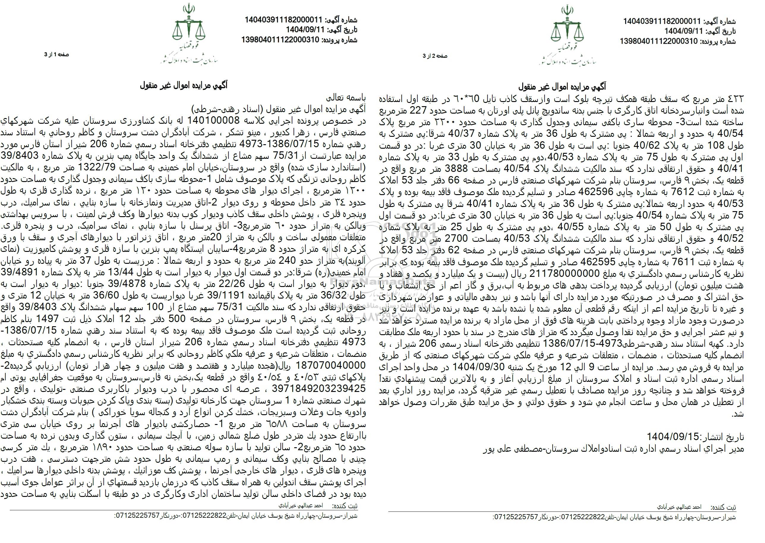 در خصوص پرونده اجرایی کلاسه 140100008 له بانک کشاورزی سروستان علیه شرکت شهرکهای صنعتی فارس، زهرا کدیور، مینو تشکر، شرکت آبادگران دشت سروستان و کاظم روحانی به استناد سند رهنی شماره 1386.07.15-4973 تنظیمي دفترخانه اسناد رسمی شماره 206 شیراز استان فارس مورد مزایده عبارتست از 75.31 سهم مشاع از ششدانگ یک واحد جایگاه پمپ بنزین به پلاک شماره 39.8403 استاندارد سازی شده واقع در سروستان خیابان امام خمینی به مساحت 1322.79 متر مربع ، به مالکیت کاظم روحانی ترنگی که پلاک موصوف شامل -1 محوطه سازی باکف سیمانی و جدول گذاری به مساحت حدود 1300 متر مربع، اجرای دیوارهای محوطه به مساحت حدود 120 متر مربع، نرده گذاری قاری به طول حدود 34 متر داخل محوطه و روی دیوار -2- اتاق مدیریت و نمازخانه با سازه بنایی ، نمای سراميك، درب وپنجره فلزی ، پوشش داخلی سقف کاذب و دیوار کوب بدنه دیوارها وكف فرش لمینت، با سرویس بهداشتی و بالکن به متراز حدود 10 متر مربع 3 اتاق پرسنل با سازه بنایی نمای سرامیک درب و پنجره فلزی متعلقات معمولی ساخت و بالکن به متراژ 20 متر مربع، اتاق ژنراتور با دیوارهای آجری و سقف با ورق کرکره ای به متراز حدود 8 متر مربع -4 - سایبان ایستگاه پمپ بنزین با سازه فلزی و پوشش کامپوزیت نمای آلویند به متراز حدو 240 متر مربع به حدود و اربعه شمالا : مرزیست به طول 37 متر به پیاده رو خیابان امام خمینی (ره) شرقا در دو قسمت اول دیوار به دیوار است به طول 13.44 متر به پلاک شماره 39.4891 دوم دیوار به دیوار است به طول 22.26 متر به پلاک شماره 39.4878 جنوبا : دیوار به دیوار است به طول 36.32 متر به پلاک باقیمانده 39.1191 غربا دیواریست به طول 36.60 متر به خیابان 12 متری و حقوق ارتفاقی ندارد که سند مالکیت 75.31 سهم مشاع از 100 سهم سهام ششدانگ پلاک 39.8403 واقع در قطعه یک بخش 9 فارس سروستان در صفحه 500 دفتر جلد 12 املاک ذیل ثبت 1497 بنام كاظم روحانی ثبت گردیده است ملک موصوف فاقد بیمه بوده که به استناد سند رهني شماره 1386.07.15 4973 تنظيمي دفترخانه اسناد رسمی شماره 206 شیراز استان فارس به انضمام كليه مستحدثات . منضمات، متعلقات شرعیه و عرفيه ملکی کاظم روحانی که برابر نظریه کارشناس رسمی دادگستری به مبلغ 187070040000 ريال هجده میلیارد و هفتصد و هفت میلیون و چهار هزار تومان ارزیابی گردیده 2 پلاکهای ثبتى 40.53 و 40.54 واقع در قطعه یک بخش نه فارس سروستان به موقعیت جغرافیایی بوتی ام 3971849203239425 ، عرصه ای محصور با درب و دیوار با کاربری صنعتی تولیدی ، واقع در شهرك صنعتی شماره 1 سروستان جهت کارخانه تولیدی بسته بندی و پاک کردن حبوبات و بسته بندی خشکبار و ادویه جات و غلات و سبزیجات خشک کردن انواع آرد و کنجاله سویا خوراکی ( بنام شرکت آبادگران دشت سروستان به مساحت ٦٥٨٨ متر مربع -1 حصارکشی با دیوارهای آجرنما بر روی خیابان سی متری با ارتفاع حدود يك متر در طول ضلع شمالی زمین با ایچک سیمانی، ستون گذاری و بدون نرده به مساحت حدود 10 متر مربع 2 سالن تولید با سازه سوله صنعتی به مساحت حدود 1890 متر مربع ، يك متر كرسي چینی با مصالح بنايي وكف سیمانی و رمپ سیمانی به طول حدود شش مترجهت دسترسی، هفت درب وپنجره های فلری، دیوارهای خارجی آجرنما، پوشش کف موزائيك ، پوشش بدنه داخلی دیوارها سراميك . اجرای پوشش سقف اندولین به همراه سقف کاذب که در زمان بازدید قسمتهای از آن براثر عوامل جوی اسبب دیده بود در فضای داخلی سالن تولید ساختمان اداری و کارگری در دو طبقه با اسکلت بنایی به مساحت حدود 422 متر مربع که سقف طبقه همکف تیرچه بلوک است و از سقف کاذب نايل 6065 در طبقه اول استفاده شده است و انبار سردخانه اتاق کارگری با جنس بدنه ساندویچ پانل پلی اورتان به مساحت حدود 227 متر مربع ساخته شده است -3 محوطه سازی با کفی سیمانی و جدول گذاری به مساحت حدود 2300 متر مربع پلاک 40.54 به حدود و اربعه شمالا : پی مشترک به طول 36 متر به پلاک شماره 40.37 شرقا بی مشترک به طول 108 متر به پلاک 40.62 جنوبا : پی است به طول 36 متر به خیابان 30 متری غربا در دو قسمت اول پی مشترک به طول 75 متر به پلاک شماره 40.53 دوم پی مشترک به طو