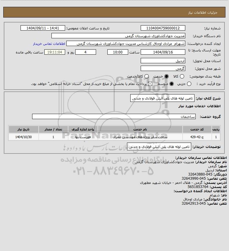 شرح کلی نیاز: تامین لوله های پلی اتیلن فولادی و چدنی