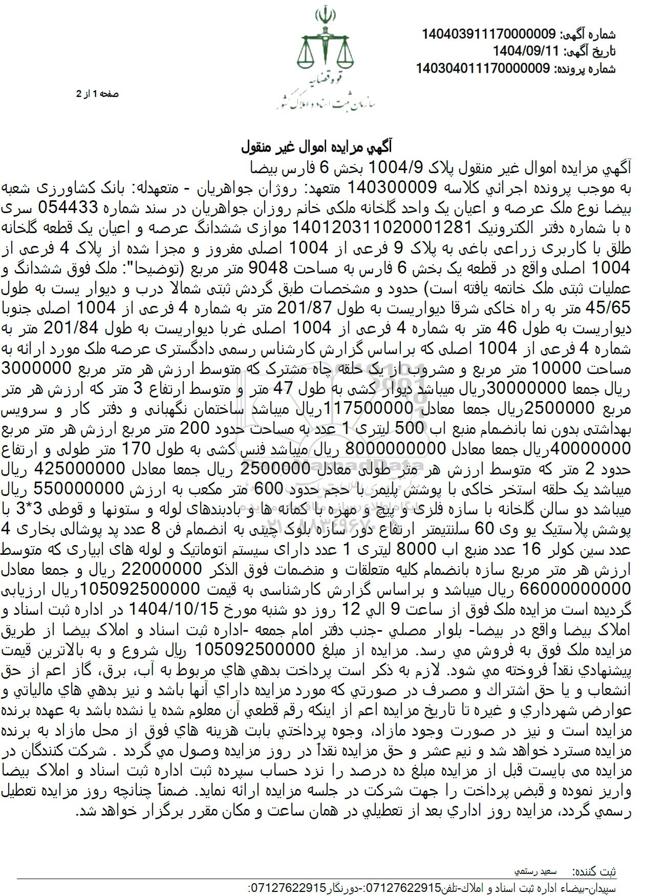 آگهی مزایده اموال غیر منقول پلاک 1004.9 بخش 6 فارس بیضا