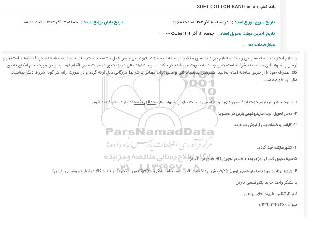 استعلام بها و موضوع استعلام استعلام باند کشی SOFT COTTON BAND 10 به اطلاع کلیه شرکتها و افراد متخصص واجد شرایط میرساند، آگهی گذار در نظر دارد از طریق استعلام بها، نسبت به انتخاب و دریافت پیشنهادات اقدام نماید. این استعلام با کد آگهی ثبت شده در سامانه خبرگزاری پارس نماد : 9935069 منتشر شده است. مشخصات استعلام : تاریخ شروع استعلام: 1404/09/11 آخرین مهلت ارسال پیشنهاد قیمت : 1404/09/14 و محل اجرای پروژه : استان مناقصات استان بوشهر میباشد. استعلام قیمت مورد درخواست : استعلام باند کشی SOFT COTTON BAND 10 با دستهبندیهای تخصصی و گروه های مرتبط : خدمات و تجهیزات آزمایشگاهی و پزشکی, استعلام اطلاع رسانی میگردد.