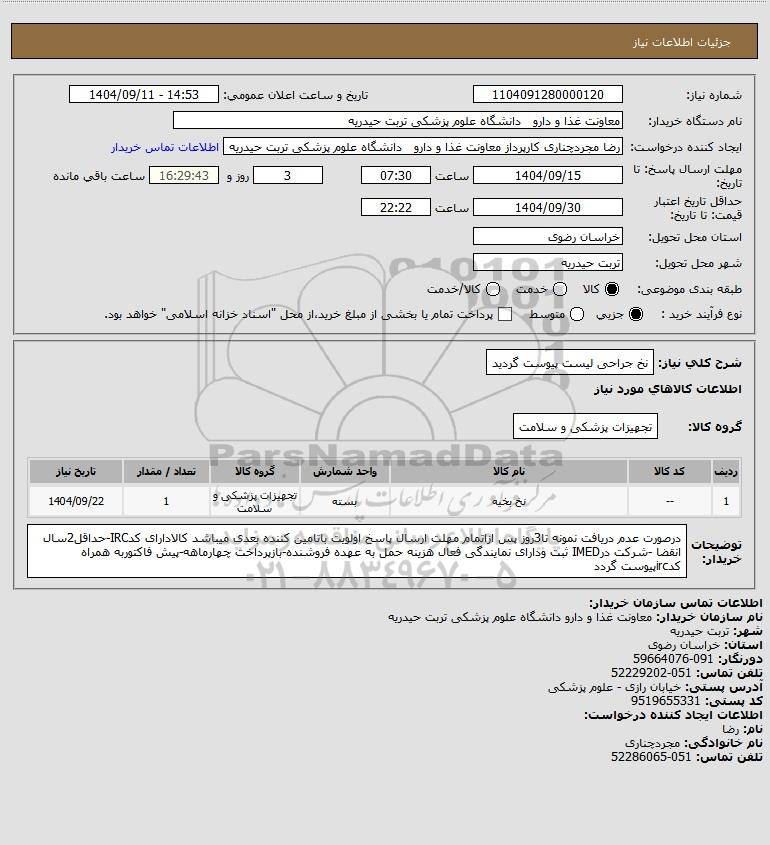 شرح کلی نیاز: نخ جراحی لیست پیوست گردید