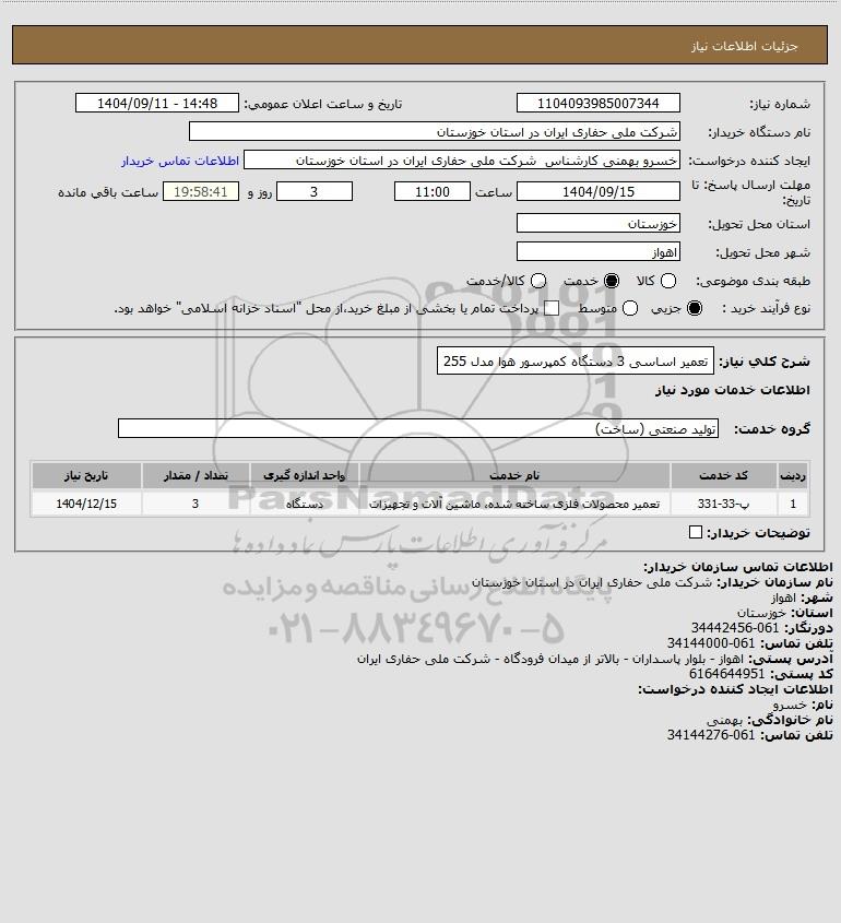 شرح کلی نیاز: تعمیر اساسی 3 دستگاه کمپرسور هوا مدل 255