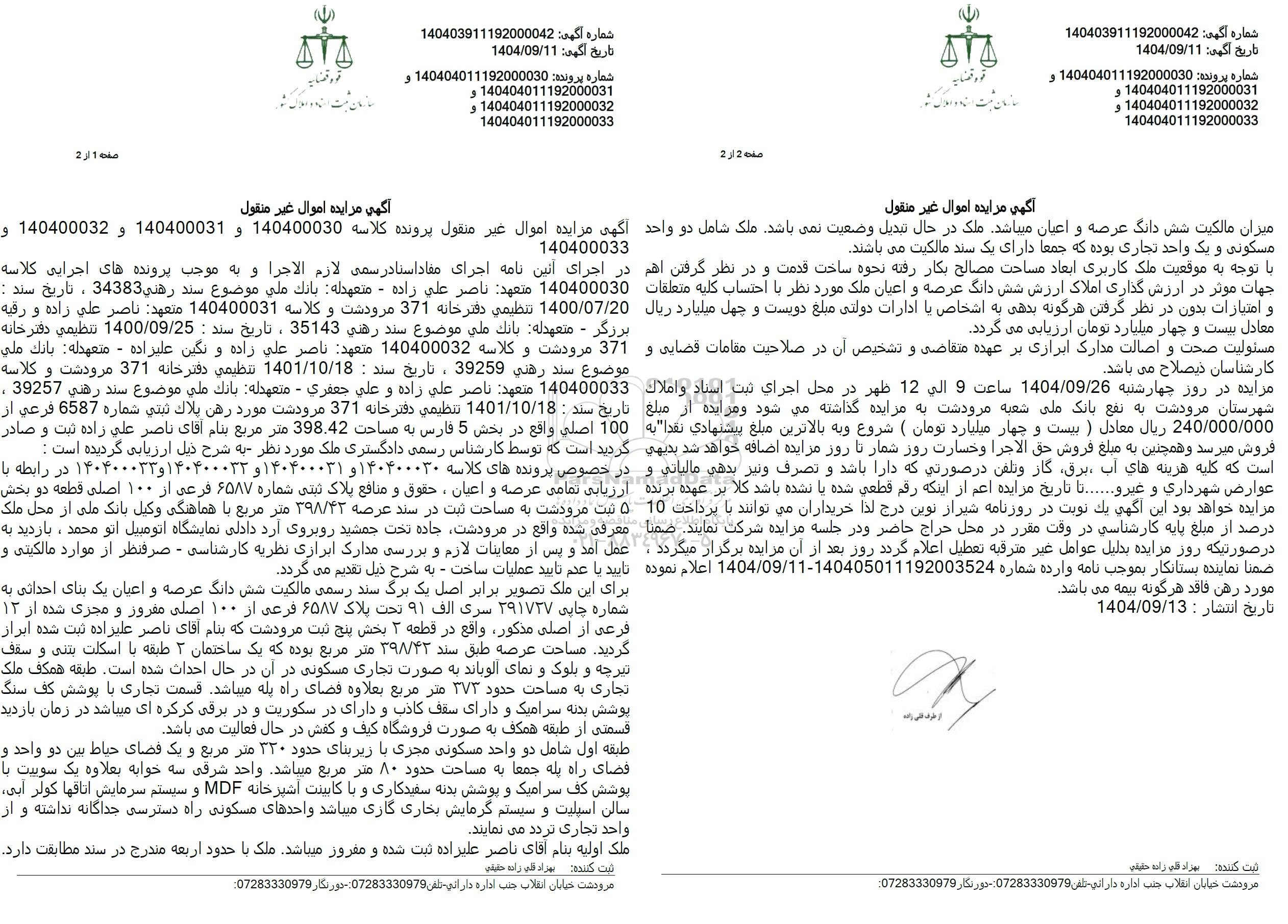 1400.07.20 تنظیمی دفترخانه 371 مرودشت و کلاسه 140400031 متعهد ناصر علی زاده و رقیه برزگر - متعهدله بانک ملی موضوع سند رهنی 35143 ، تاریخ سند : 1400.09.25 تنظیمی دفترخانه 371 مرودشت و کلاسه 140400032 متعهد ناصر علی زاده و نگین علیزاده - متعهدله : بانک ملی موضوع سند رهنی 39259 ، تاریخ سند : 1401.10.18 تنظیمی دفترخانه 371 مرودشت و کلاسه 140400033 متعهد ناصر علی زاده و علی جعفری - متعهدله بانک ملی موضوع سند رهنی 39257 ، تاریخ سند : 1401.10.18 تنظیمی دفترخانه 371 مرودشت مورد رهن پلاک ثبتی شماره 6587 فرعی از 100 اصلی واقع در بخش 5 فارس به مساحت 398.42 متر مربع بنام آقای ناصر علی زاده ثبت و صادر گردید است که توسط کارشناس رسمی دادگستری ملک مورد نظر به شرح ذیل ارزیابی گردیده است :