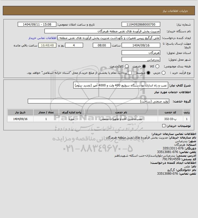 شرح کلی نیاز: نصب و راه اندازی دو دستگاه سوئیچ 400 ولت و 4000 آمپر (تجدید سوم)