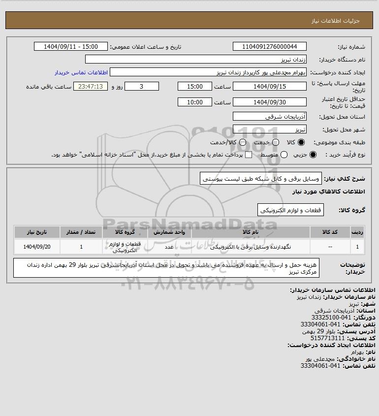شرح کلی نیاز: وسایل برقی و کابل شبکه طبق لیست پیوستی