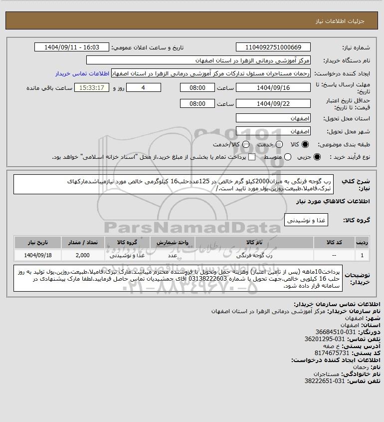 شرح کلی نیاز: رب گوجه فرنگی به میزان2000کیلو گرم خالص در 125عددحلب16 کیلوگرمی خالص مورد نیازمیباشدمارکهای تبرک،فامیلا،طبیعت،روژین،یول مورد تایید است./