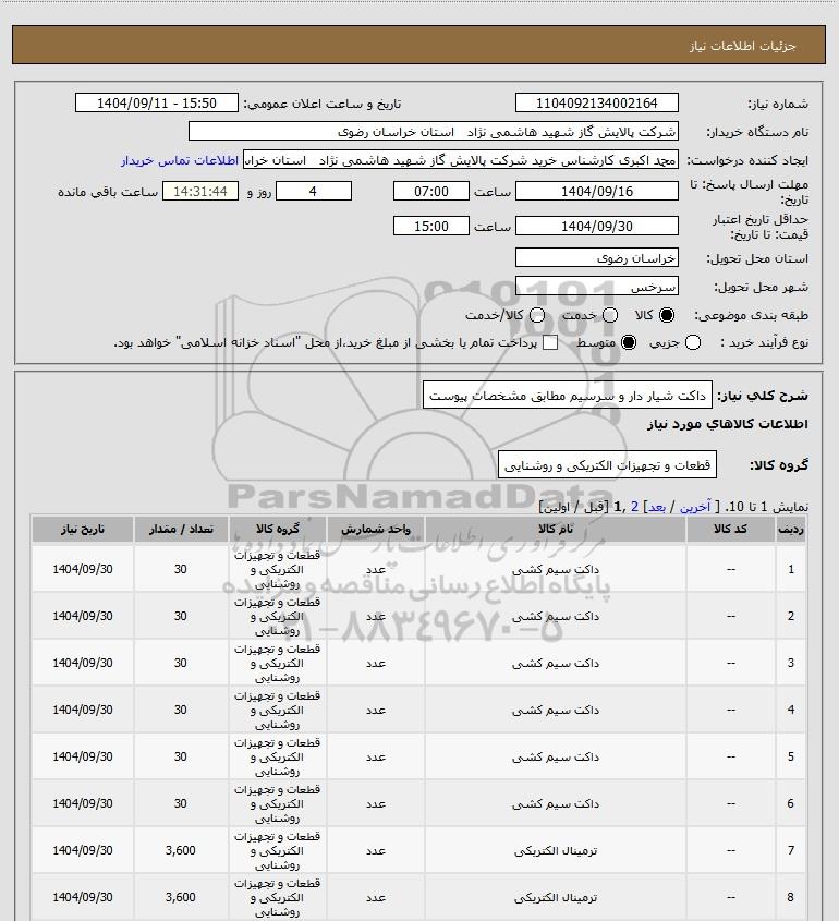 | 1 | -- | داکت سیم کشی | عدد | قطعات و تجهیزات الکتریکی و روشنایی | 30 | 1404/09/30 |