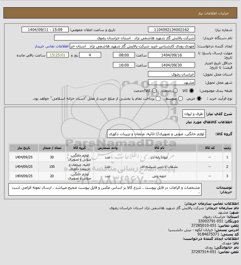 نام دستگاه خریدار:شرکت پالایش گاز شهید هاشمی نژاد استان خراسان رضوی
