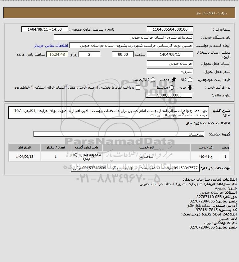 شرح کلی نیاز: تهیه مصالح واجرای سالن انتظار بهشت امام حسین برابر مشخصات پیوست .تامین اعتبار به صورت اوراق مرابحه با کارمزد 16.1 درصد تا سقف 7 میلیارد ریال می باشد