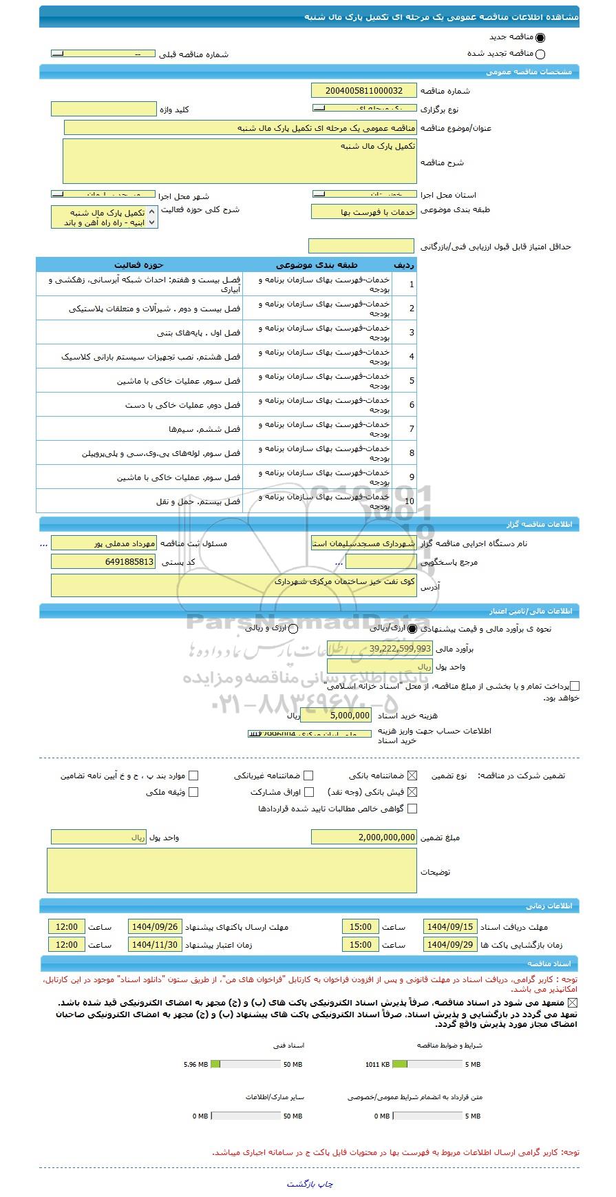 عنوان/موضوع مناقصه مناقصه عمومی یک مرحله ای تکمیل پارک مال شنبه