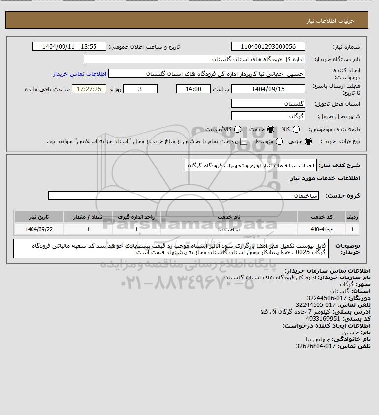 شرح کلی نیاز: احداث ساختمان انبار لوازم و تجهیزات فرودگاه گرگان