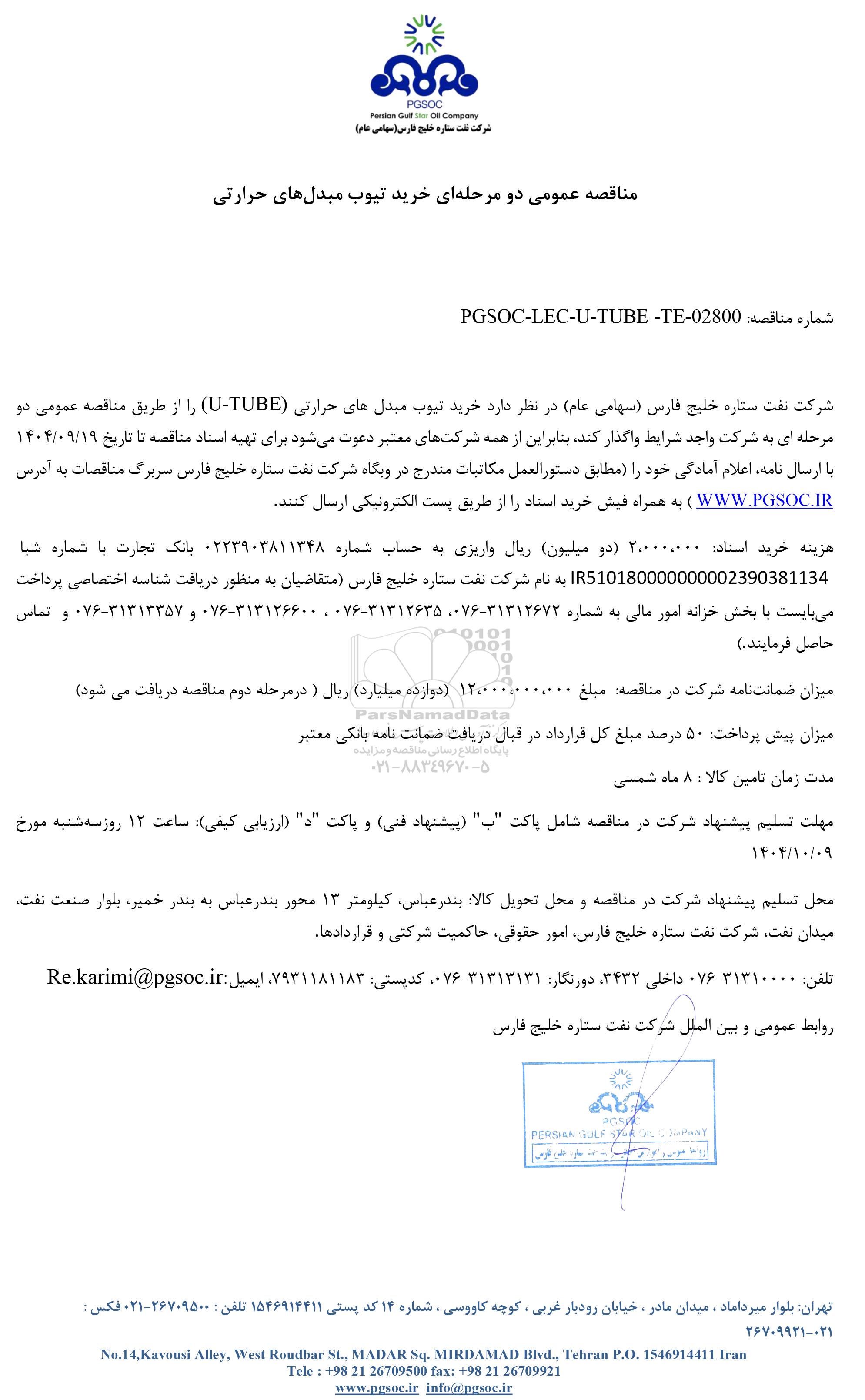 شرکت نفت ستاره خلیج فارس (سهامی عام) در نظر دارد خرید تیوب مبدل های حرارتی (U-TUBE) را از طریق مناقصه عمومی دو مرحله ای به شرکت واجد شرایط واگذار کند، بنابراین از همه شرکتهای معتبر دعوت میشود برای تهیه اسناد مناقصه تا تاریخ 1404.09.19 با ارسال نامه، اعلام آمادگی خود را (مطابق دستورالعمل مکاتبات مندرج در وبگاه شرکت نفت ستاره خلیج فارس سربرگ مناقصات به آدرس WWW.PGSOC.IR ) به همراه فیش خرید اسناد را از طریق پست الکترونیکی ارسال کنند.