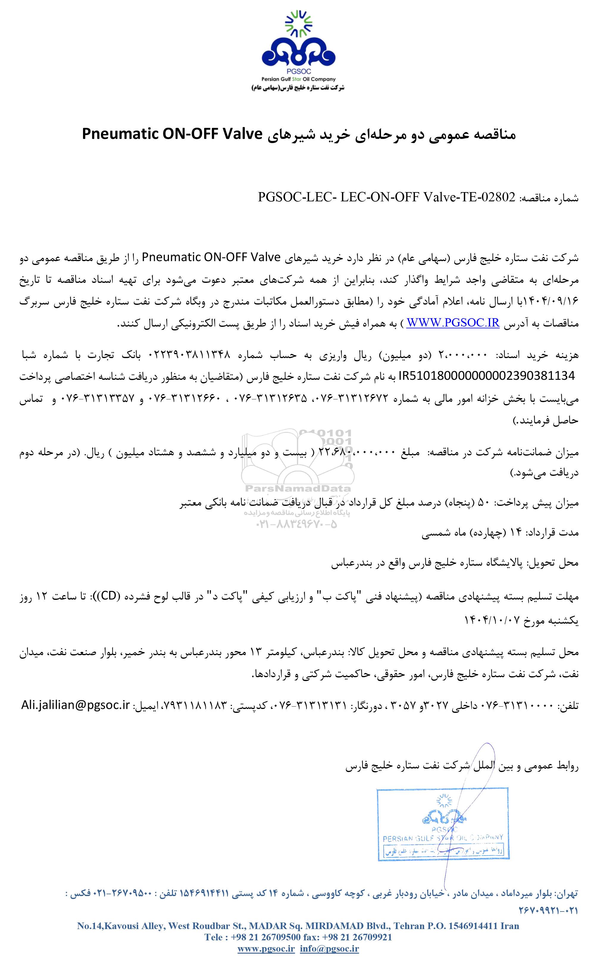 شماره مناقصه: PGSOC-LEC- LEC-ON-OFF Valve-TE- 02802