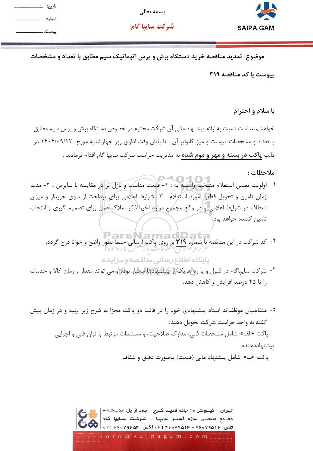 موضوع: تمدید مناقصه خرید دستگاه برش و پرس اتوماتیک سیم مطابق با تعداد و مشخصات پیوست با کد مناقصه 319