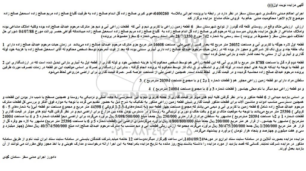 ارزش  ارزیابی ملک واقع در روستای قلعه گاه گودرز از توابع شهرستان سقز  6 قطعه زمین زراعی با کاربری دیم و آبی که  قطعات زراعی آبی و دیم جز ماترک مرحوم عبدالله صالح زاده بوده وکلیه املاک مشاعی بوده واملاک مشاعی از طریق مزایده بفروش میرسد ورثه مرحوم کبری صالح زاده گل اندام صالح زاده به  گلباغ صالح زاده مریم صالح زاده اسمعیل صالح زاده میباشدکه گواهی حصر وراثت مورخ 04/07/88 شورای حل اختلاف شهرستان سقز ( مضبوط در پرونده ) سند رسمی به شماره 742 مورخ 28/7/1350 دفتر اسناد رسمی شماره 6 سقز( مضبوط در پرونده)