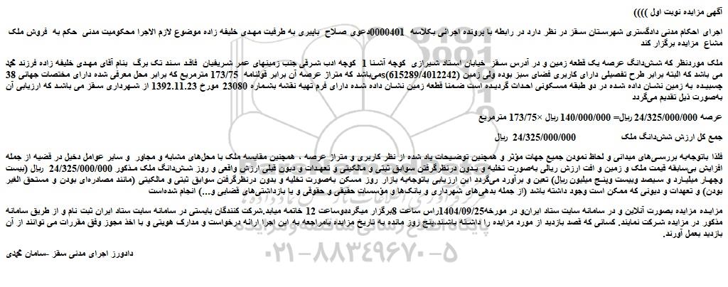 مزایده مزایده بصورت آنلاین و در سامانه سایت ستاد ایرانو در مورخه1404/09/25راس ساعت 8برگزار میگرددوساعت 12 خاتمه میابد.شرکت کنندگان بایستی در سامانه سایت ستاد ایران ثبت نام و از طریق سامانه مذکور در مزایده شرکت نمایند. کسانی که قصد بازدید از مورد مزایده را داشته باشند،پنج روز مانده به تاریخ مزایده بامراجعه به این اجرا ارائه درخواست و مدارک هویتی و با اخذ مجوز وفق مقررات می توانند از آن بازدید بعمل آورند.