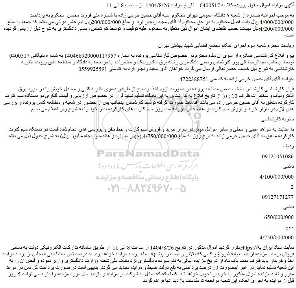 آگهی مزایده اموال منقول پرونده کلاسه 0400517 تاریخ مزایده 1404/8/26 از ساعت 8 الی 11