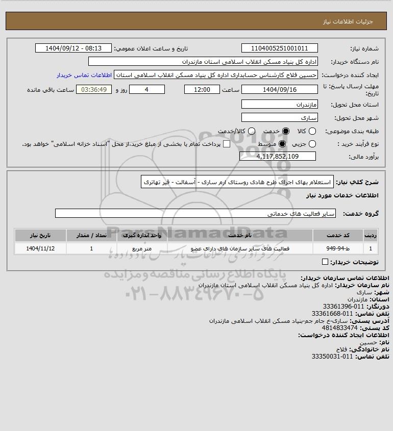 شرح کلی نیاز: استعلام بهای اجرای طرح هادی روستای ارم ساری - آسفالت - قیر تهاتری