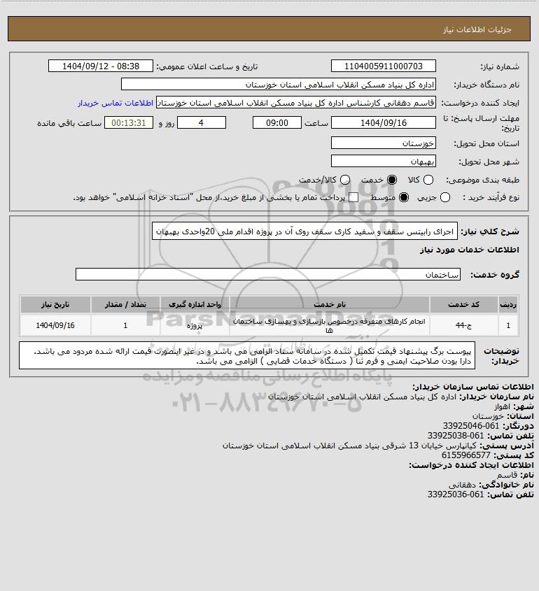 شرح کلی نیاز: اجرای رابیتس سقف و سفید کاری سقف روی آن در پروژه اقدام ملی 20واحدی بهبهان