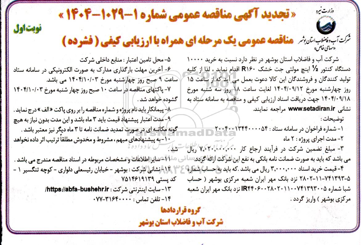 شرکت آب و فاضلاب استان بوشهر در نظر دارد نسبت به خرید 10000 دستگاه کنتور 1.2 اینچ مولتی جت خشک R160 اقدام نماید. لذا از کلیه تولیدکنندگان و فروشندگان این کالا دعوت به عمل می آید که از ساعت 15 روز 4شنبه مورخ 1404.9.12 لغایت ساعت 18 صبح روز 3شنبه مورخ 1404.9.18 جهت دریافت اسناد ارزیابی کیفی و مناقصه به سامانه ستاد ایران مراجعه نمایند.