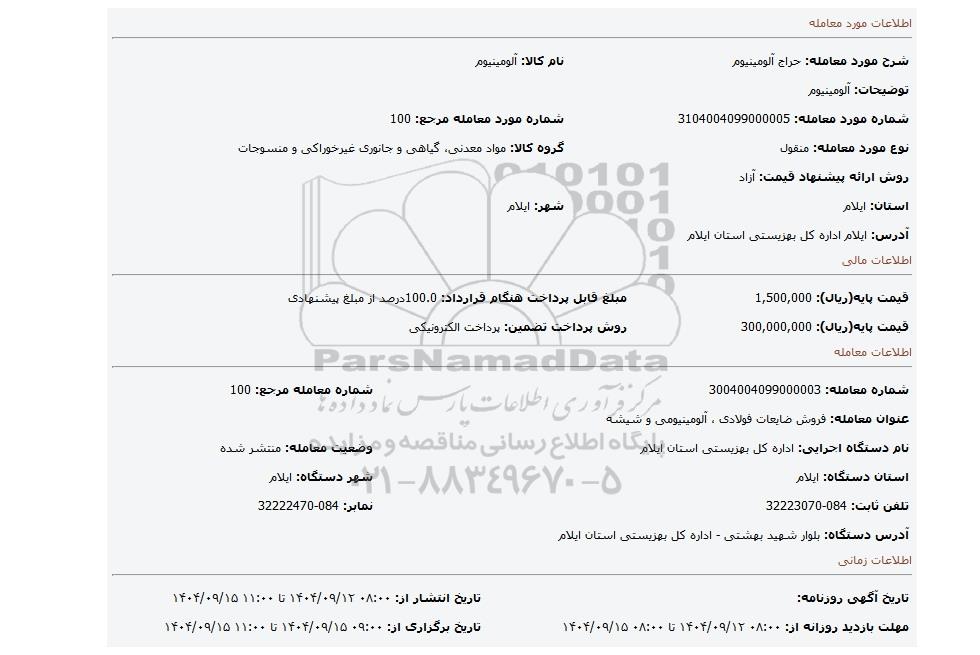 | شرح مورد معامله: حراج آلومینیوم | نام کالا: آلومینیوم | |