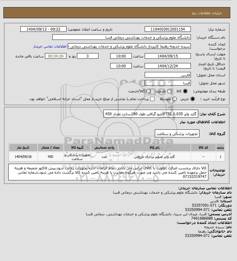 شرح کلی نیاز: گاید وایر 0.035 PTFEآنژیو گرافی طول 180سانت تعداد 450