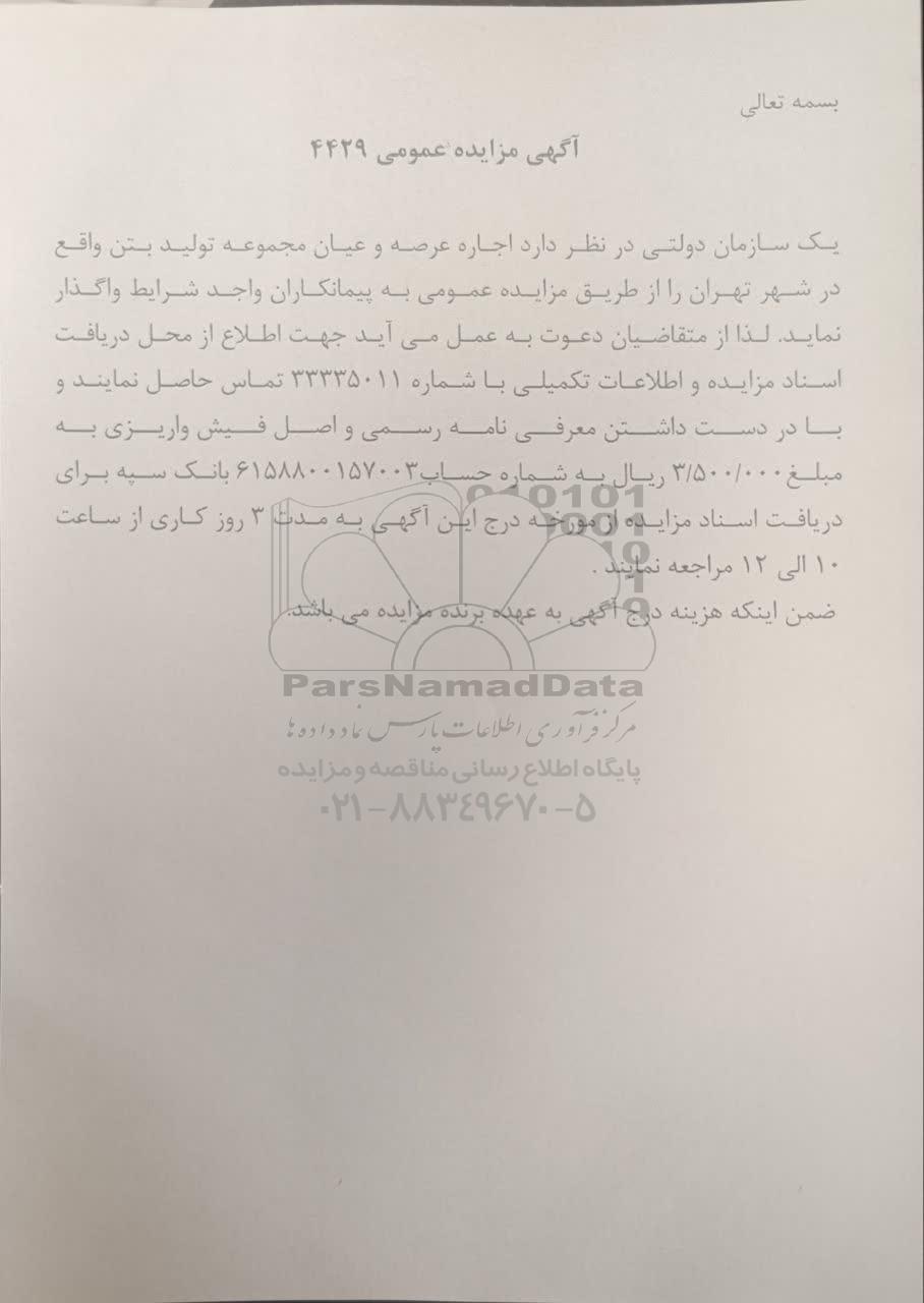 یک سازمان دولتی در نظر دارد اجاره عرصه و عیان مجموعه تولید بتن واقع در شهر تهران را از طریق مزایده عمومی به پیمانکاران واجد شرایط واگذار نماید. لذا از متقاضیان دعوت به عمل می آید جهت اطلاع از محل دریافت اسناد مزایده و اطلاعات تکمیلی با شماره 33335011 تماس حاصل نمایند و با در دست داشتن معرفی نامه رسمی و اصل فیش واریزی به مبلغ 3.500.000 ریال به شماره حساب 6158800157003 بانک سپه برای دریافت اسناد مزایده از مورخه درج این آگهی به مدت 3 روز کاری از ساعت 10 الی 12 مراجعه نمایند