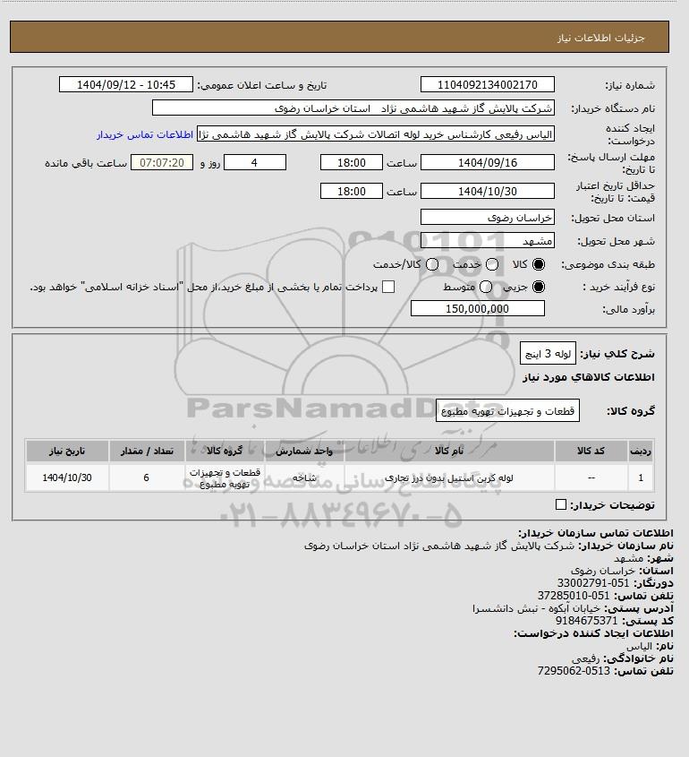 نام دستگاه خریدار:شرکت پالایش گاز شهید هاشمی نژاد استان خراسان رضوی