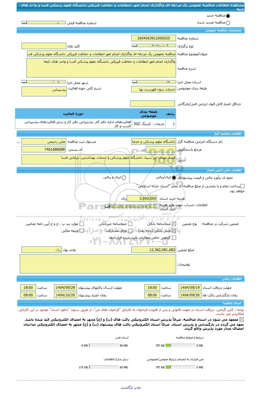 مناقصه مناقصه عمومی یک مرحله ای واگذاری انجام امور انتظامات و حفاظت فیزیکی دانشگاه علوم پزشکی فسا و واحد های تابعه, مناقصه، مناقصه عمومی یک مرحله ای واگذاری انجام امور انتظامات و حفاظت فیزیکی دانشگاه علوم پزشکی فسا و واحد های تابعه